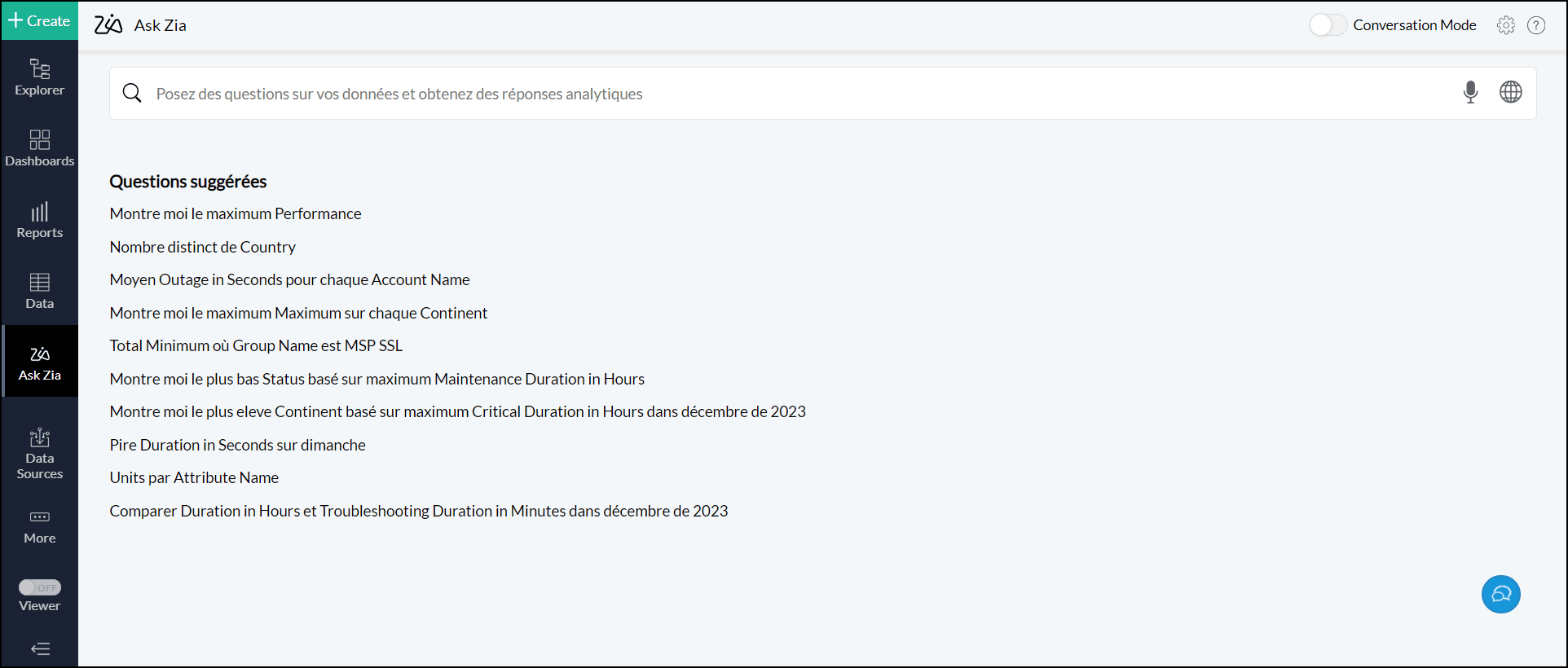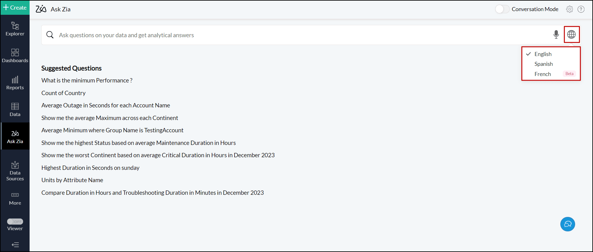 Ask Zia now supports English, Spanish, and French (Beta) languages. The language specified in your Analytics Plus account will be the default language for Zia. However, you can change this using the Language Settings option adjacent to Ask Zia's query input field.