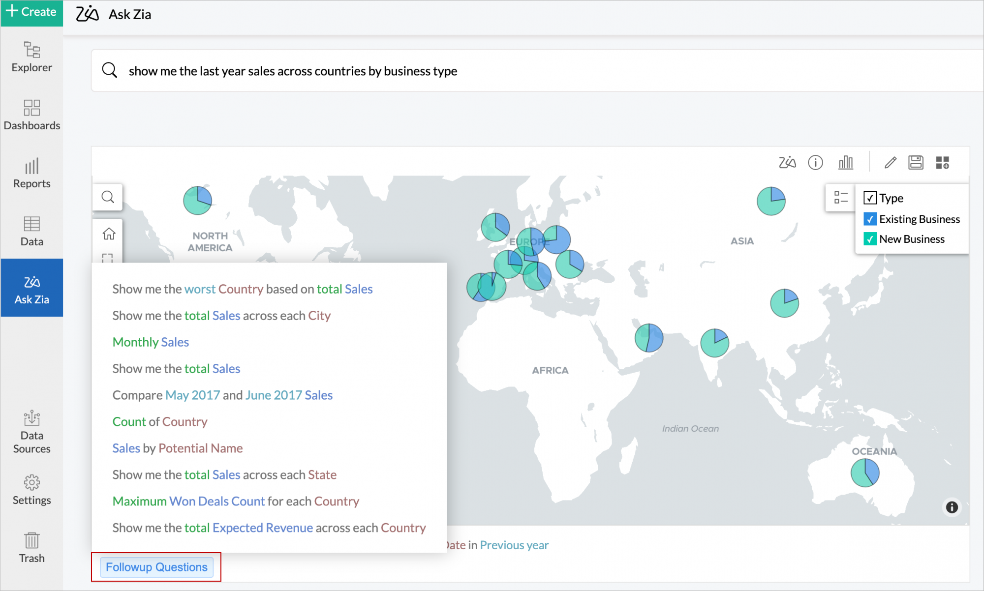 Hover over the generated report to find Followup Questions button. Click this button, and Zia will suggest a set of followup questions based on the original question.