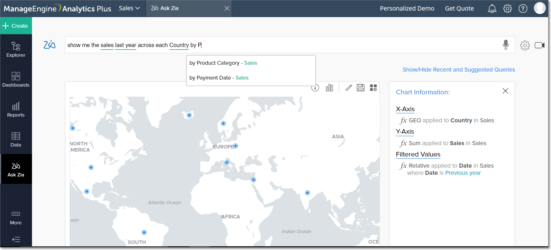 Ask Zia learns from the patterns in your questions and provides intelligent and personalized suggestions to assist you in drafting the question. These suggestions are based on the relationship among the tables, previous history, Ask Zia customizations, etc. The Auto Suggestion also suggests supporting phrases (such as Top 10, Bottom 10), sort options, chart types, and more.