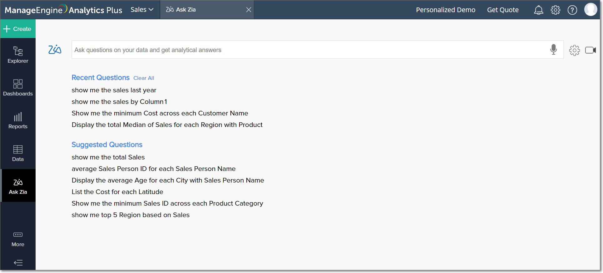 Type your question into the text box provided. Ask Zia will interpret the question and will generate the best possible report as an answer.