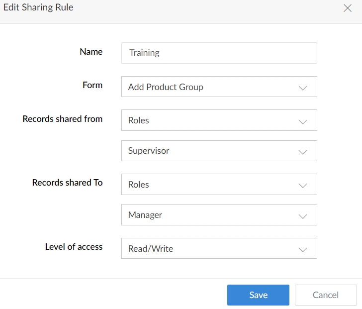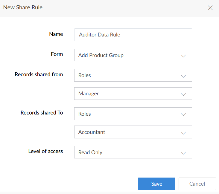 - The New Share Rule tab will be displayed. Enter the rule name, modules, records shared, and level of access. Click Save.