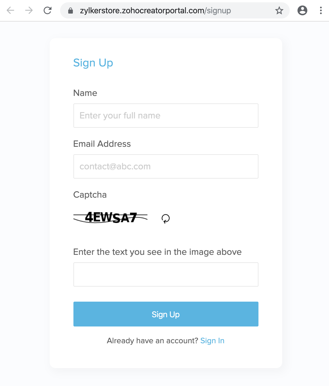 This is the page where end users sign up for your AppCreator application's portal. In case your portal is private or restricted, your approval is required to complete the signup process. Below is how the signup page looks by default: