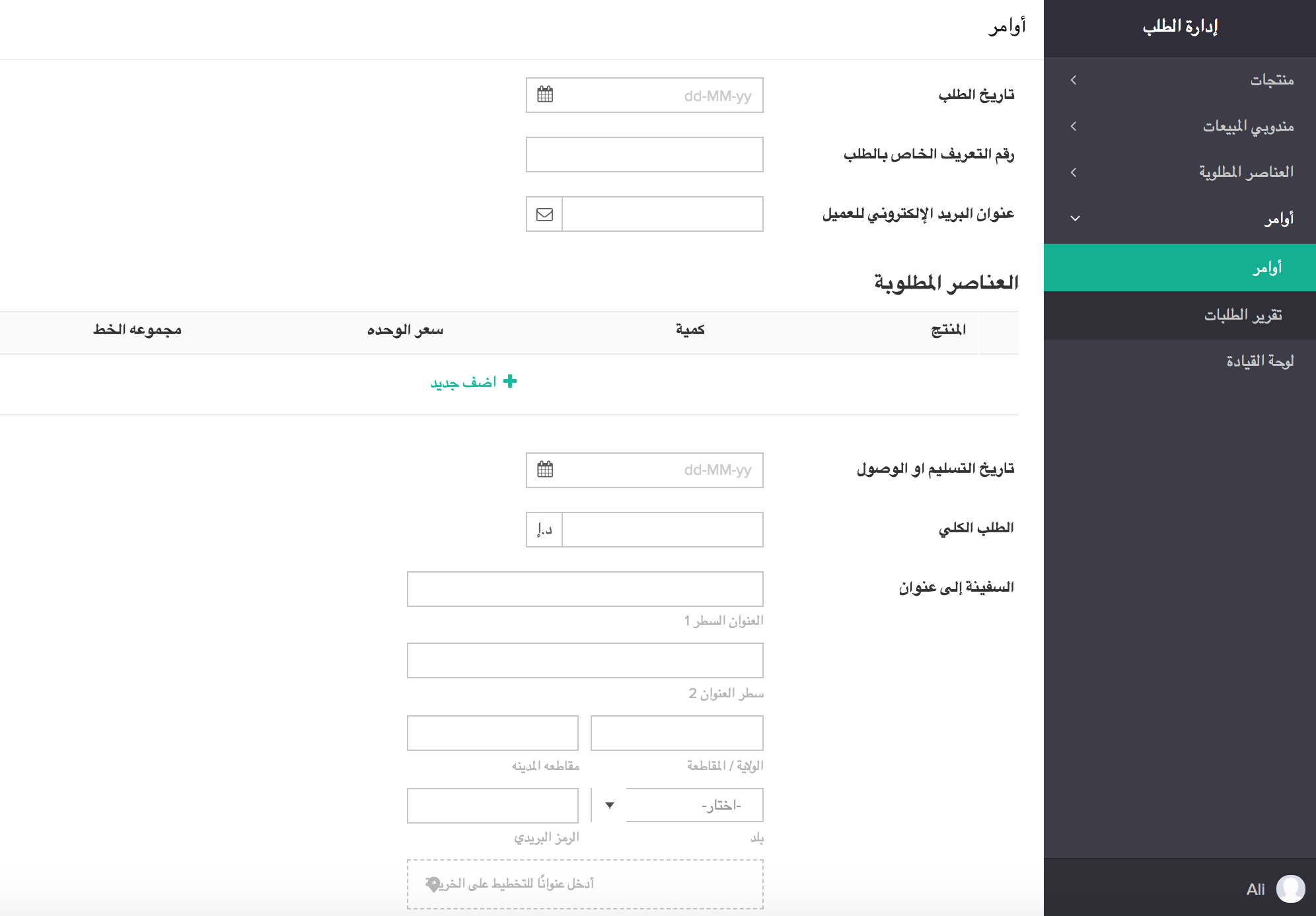 Enabling the right-to-left (RTL) layout for your app is available when it's consumed in the following languages: Arabic, Azerbaijani, Hebrew, Urdu, Yiddish, and Persian. The standard left-to-right layout is mirrored and your app's UI elements such as forms, reports, pages, fields, and buttons are displayed from right to left. Below is an example of how a form in an Order Management app will appear to users when they access in RTL-enabled Arabic:
