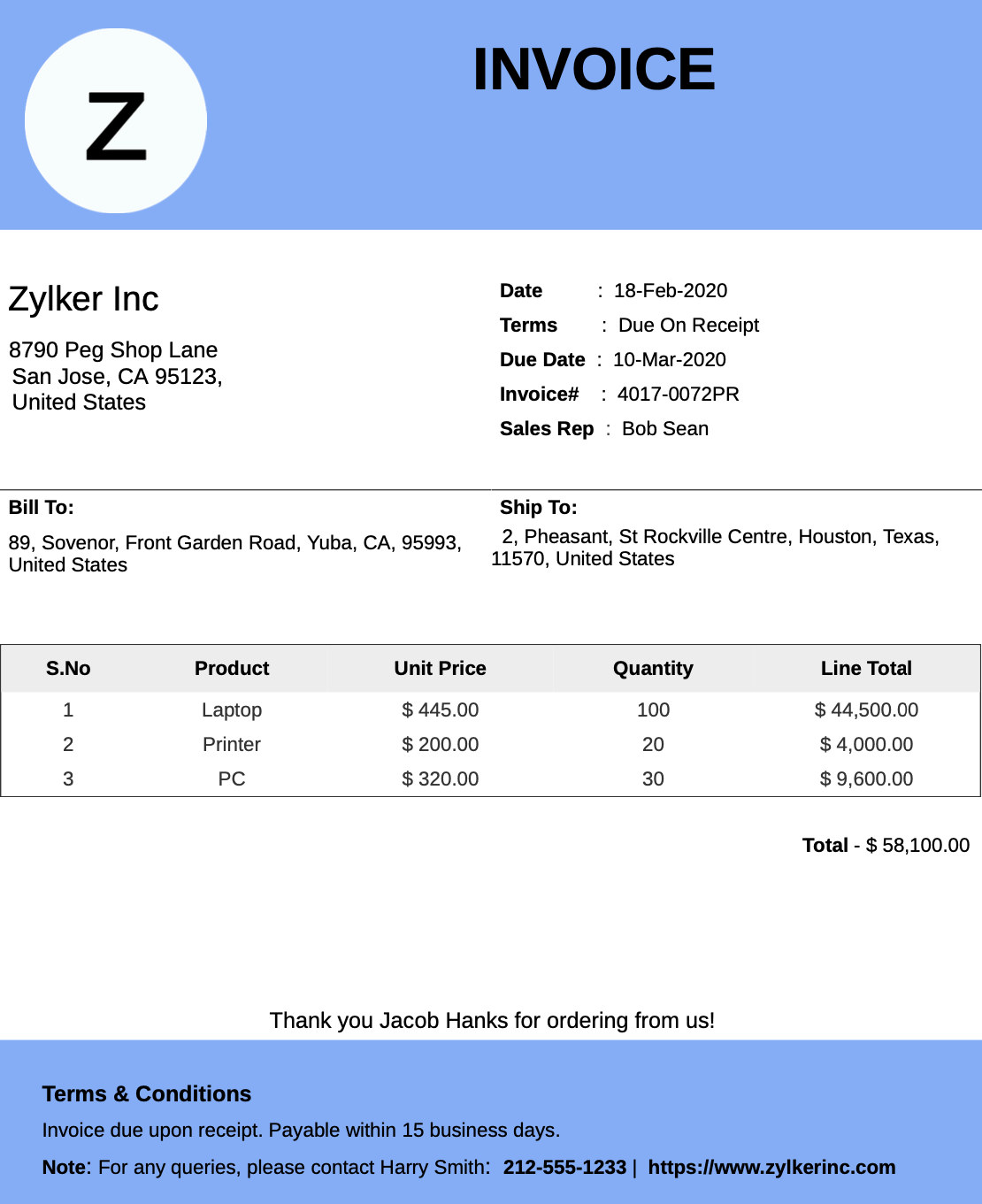 Imagine that you've created an order management application and that as users place their orders, you want to email them their invoice. Invoices contain order information, which in this example will be stored in your orders form. Creating a record template based on this form will help you automate the process of putting together the order information in the desired format. You can email the invoices using your AppCreator app by setting up an email notification upon form submission that uses a record template to include the order data in it. Below is an example of how this invoice can look: