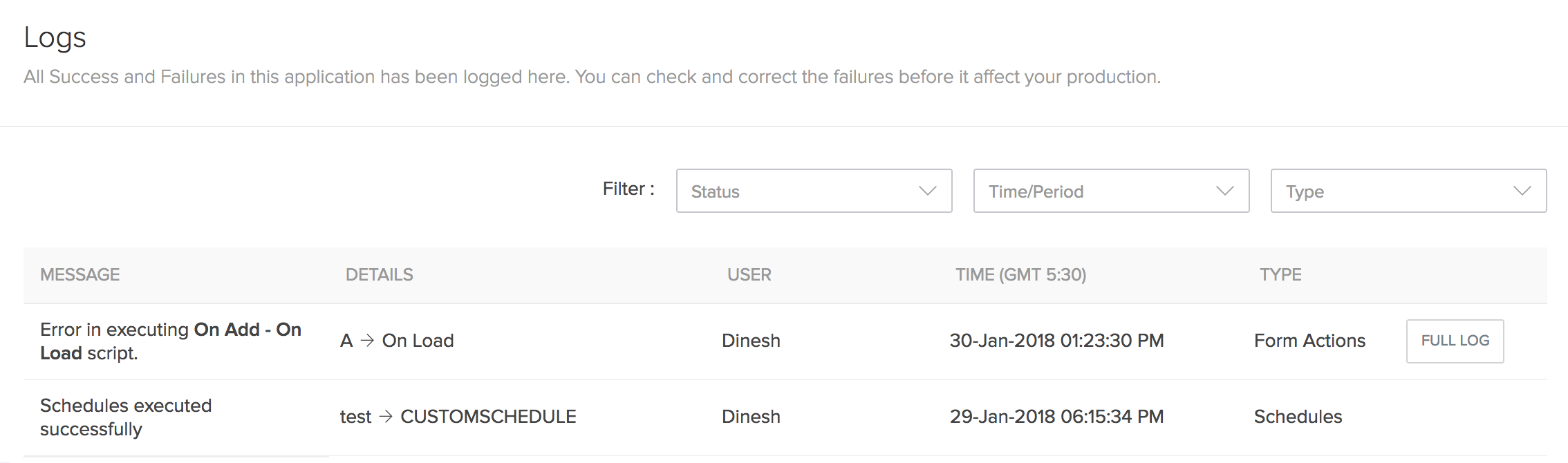 3. All the actions executed in the application are logged here. Failure logs will have an additional Full Log button to view the error details.