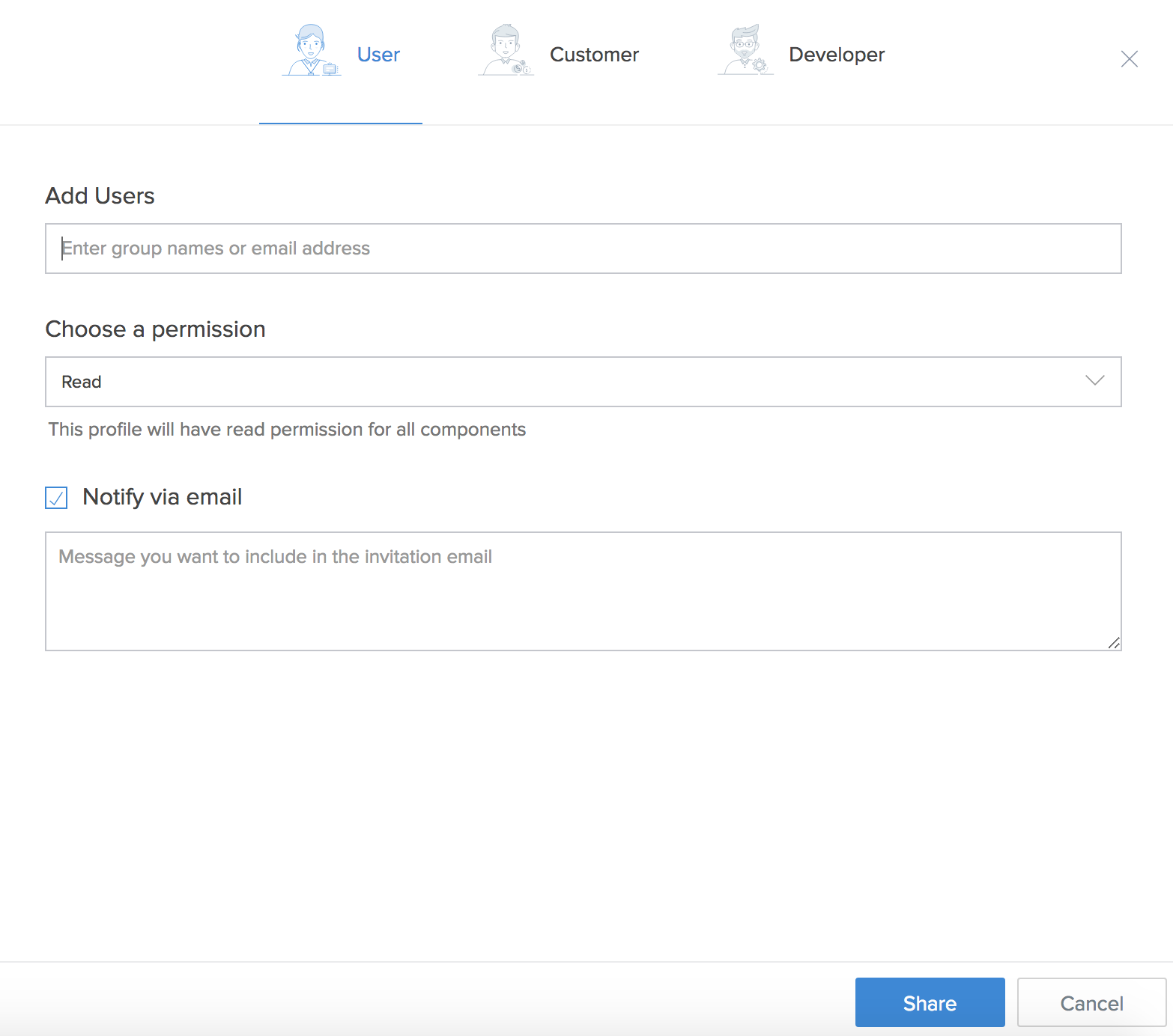 - The share application with tab will appear. This tab contains three different sections : Users, Customers , and Developers. Users are the induviduals who need to access your application. Eg: employees, consultants etc. To share application with users select the Users section.