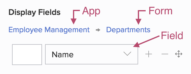 Image shows the Display Fields section of a lookup field that is configured to display data stored in the Name field, which is present in the Departments form of the Employee Management app