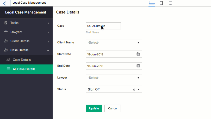 - a Case Details form to capture details about the lawyer or lawyers handling the case, the client, and information on the case like documents related to the case, the payments made, and more
