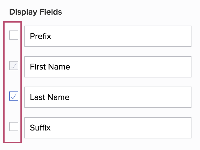 - You can enable or disable all subfields except First Name, which has a disabled checkbox next to it: