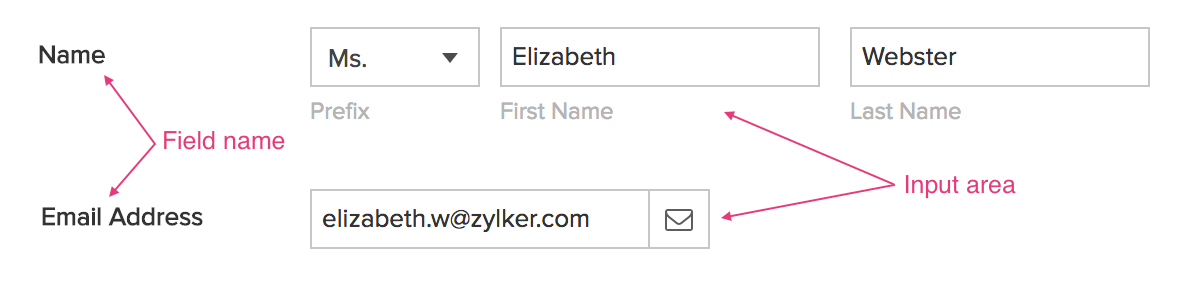 The following images show how two types of fields: name (labelled Name) and email (labelled Email Address). The input area of the Name field contains one dropdown for Prefix and input boxes for First Name and Last Name. The input area of Email Address contains one input box.