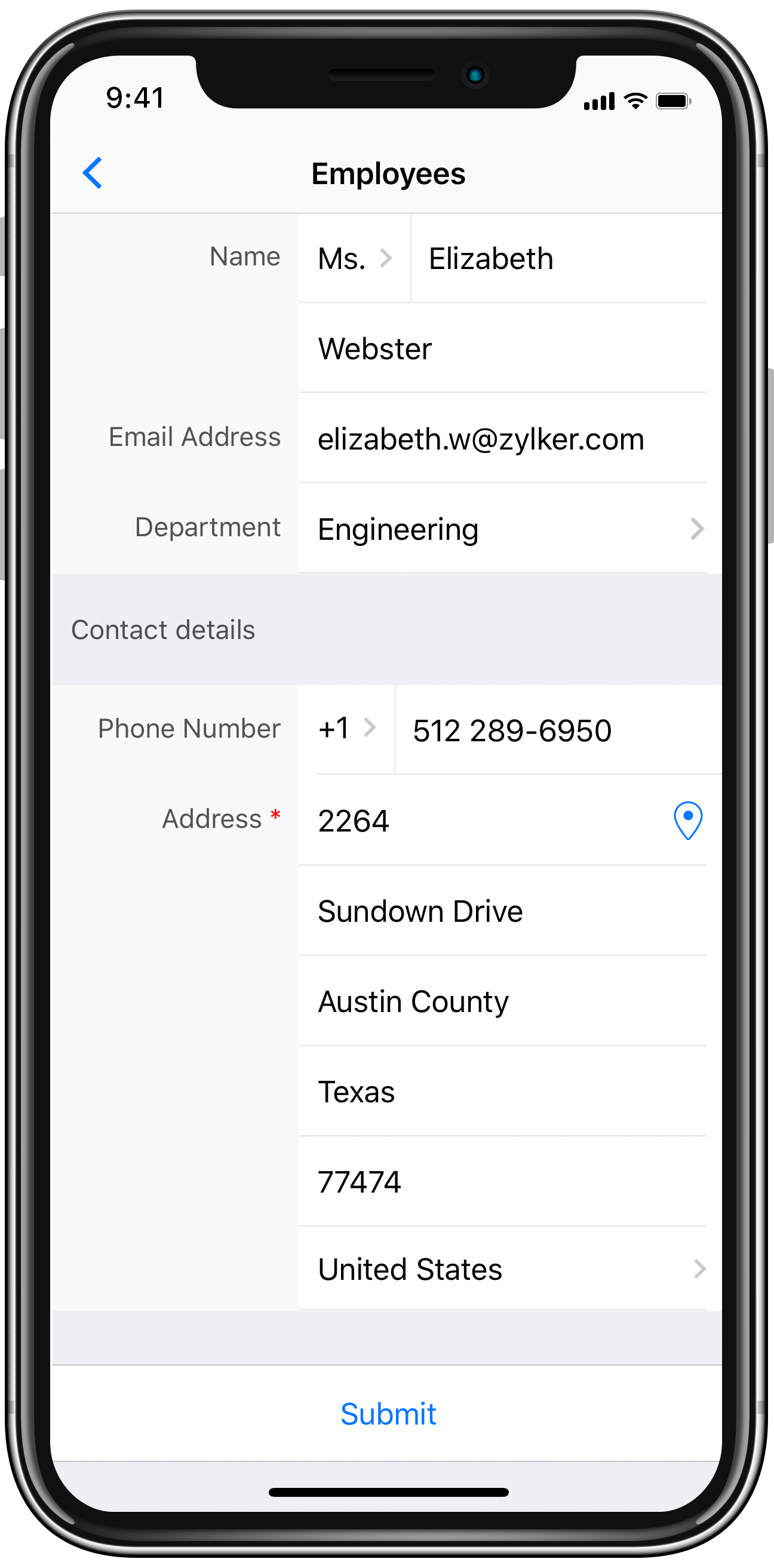 The following images show how an Employees form looks when a user accesses from a smartphone: