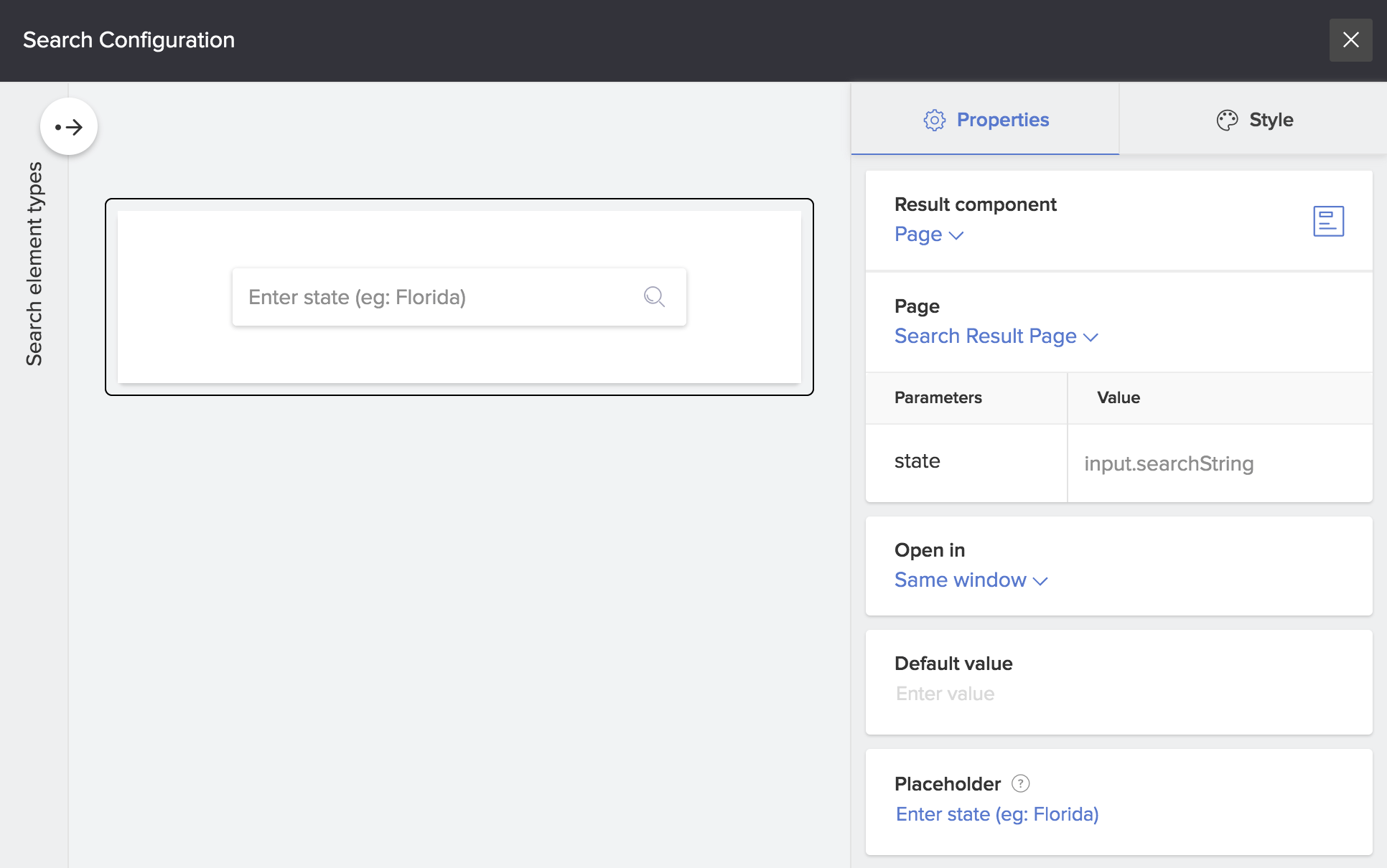 5. Set the Placeholder text. It's"Enter value" by default. This is the value that will appear in the search bar until the user enters an input in it.