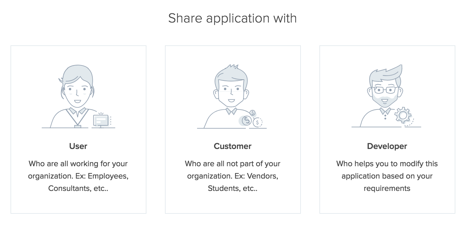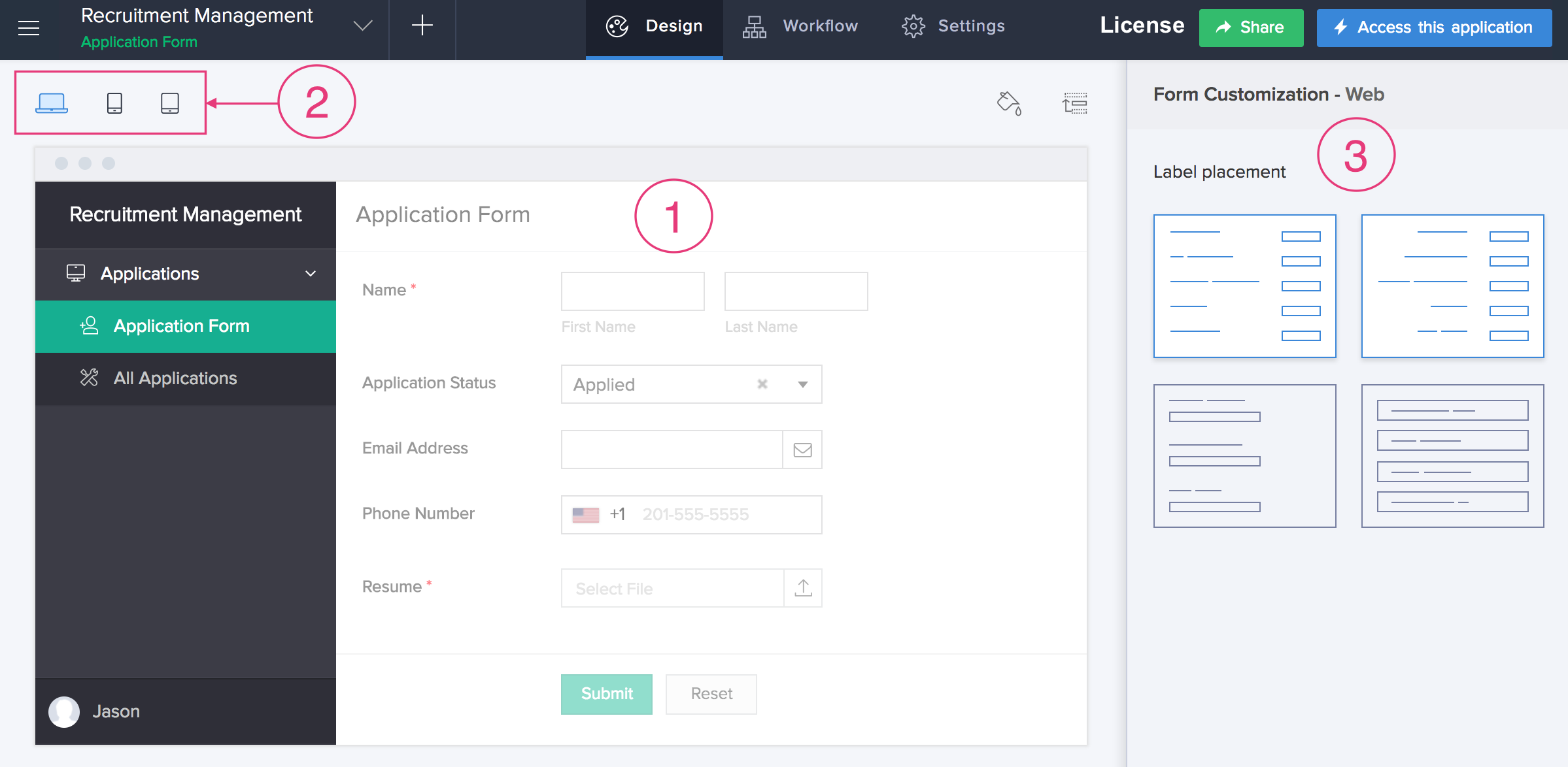 Now that you've built an app and customized it to suit your business process, the only step remaining is to share it. Sharing an app means enabling your users to access some or all components in that app. In this Recruitment Management app, the manager needs to be given access to the app. To share the app:- Click Share at the top-right corner of the Design page:
