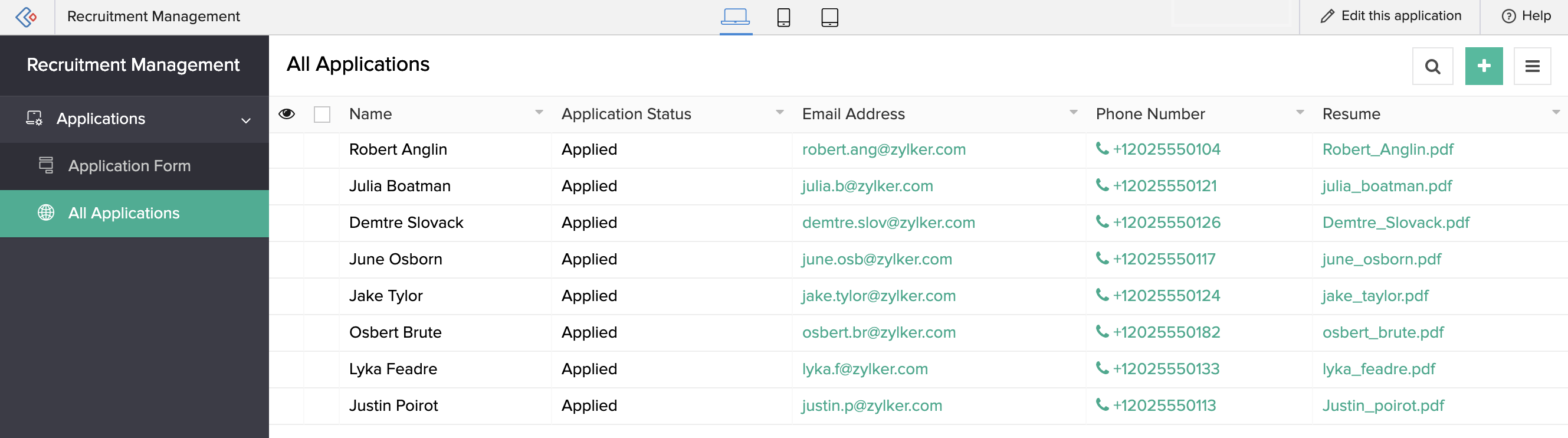 If you go through all the steps you've covered so far, you'll notice that nowhere did you create this report. When you create a form, ManageEngine AppCreator automatically creates a list report for it. A report is the component of a ManageEngine AppCreator app that enables your users to view the data submitted through a form. All Applications is the default list report of the Application Form.