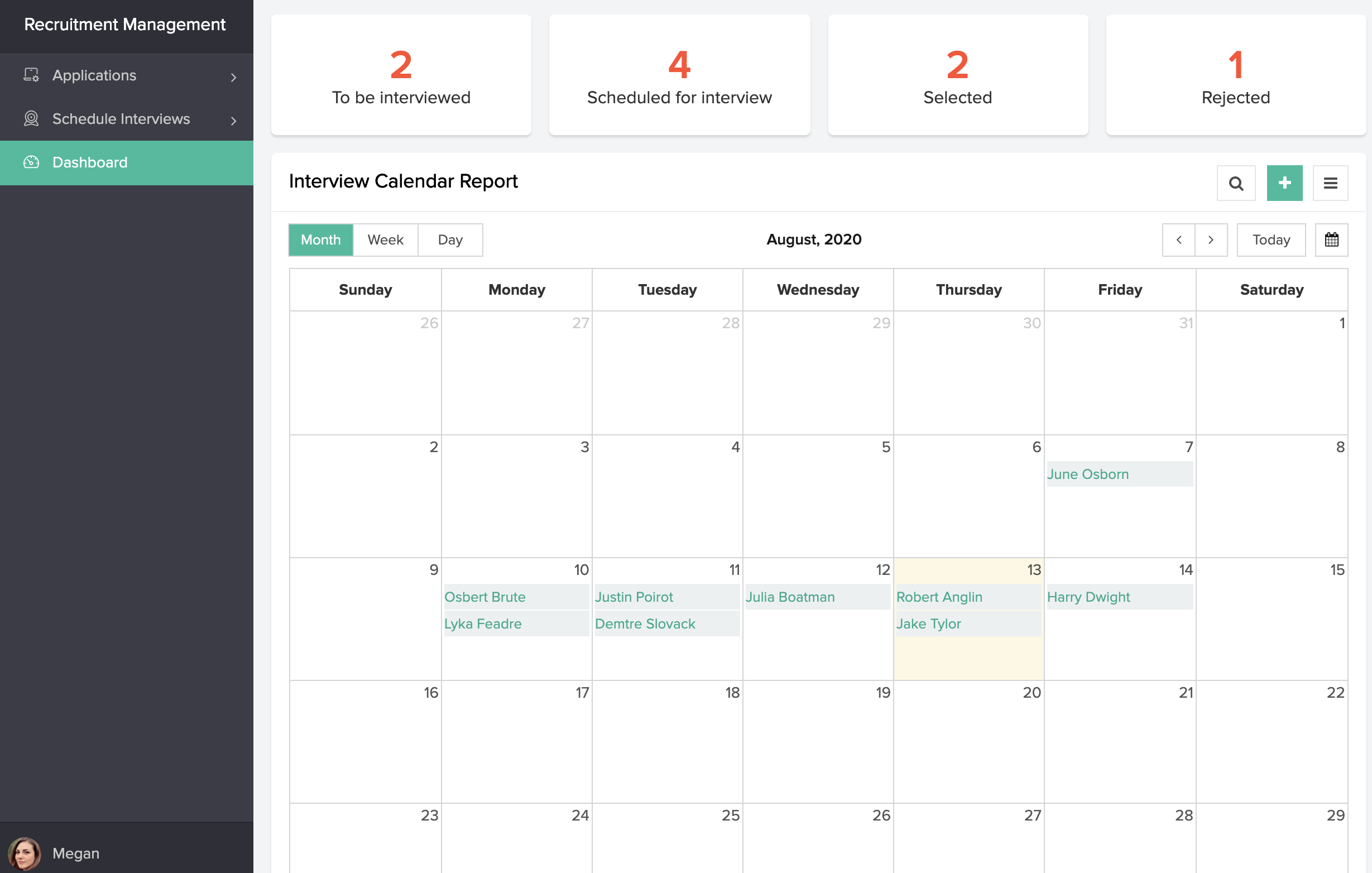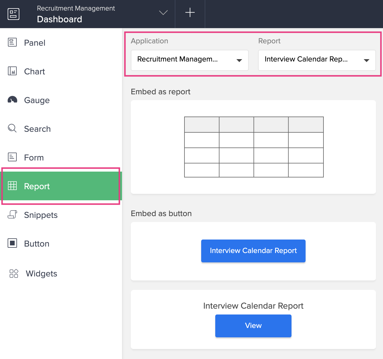 - Select Report, displayed on the left, then select the Recruitment Management application, and then select the Interview Calendar Report: