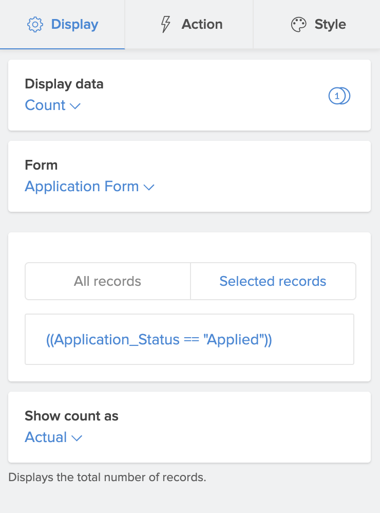 - Click Panel on the left, then repeat steps 4 to 11 such that you have a total of 4 panels in your page that show the count of records from Application Form where the Application Status is 'Applied', 'Scheduled for Interview', 'Selected', and 'Rejected'.