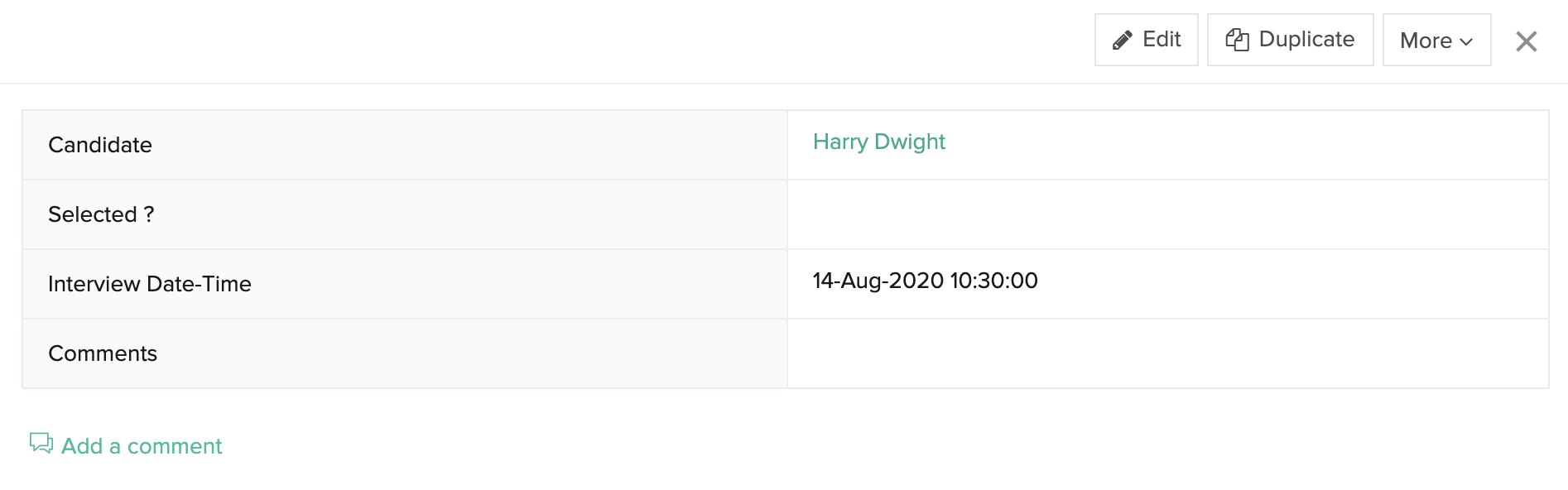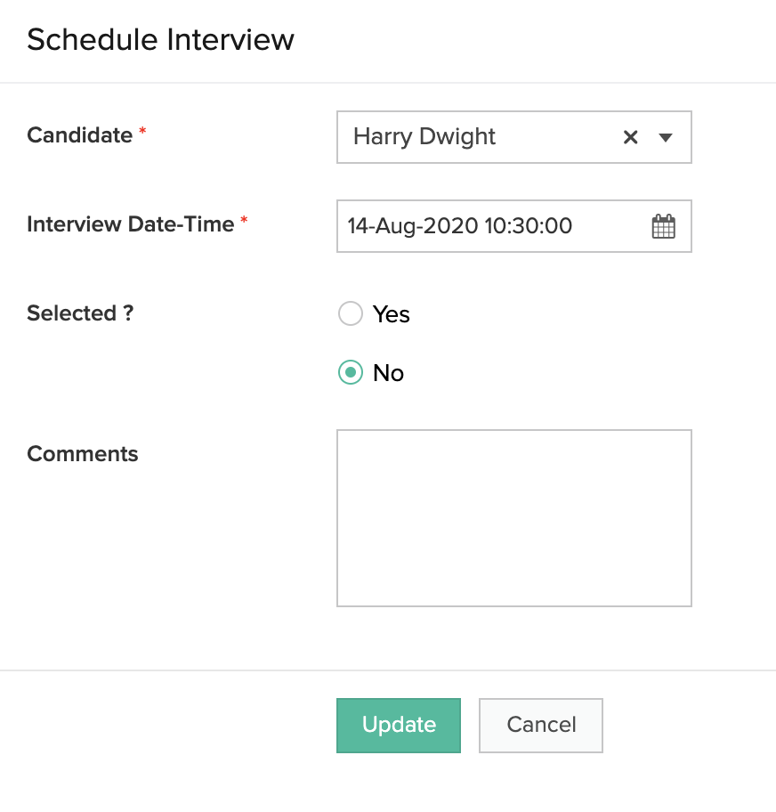 - Once the interview is over, the manager can update if the candidate is selected or not, as follows: