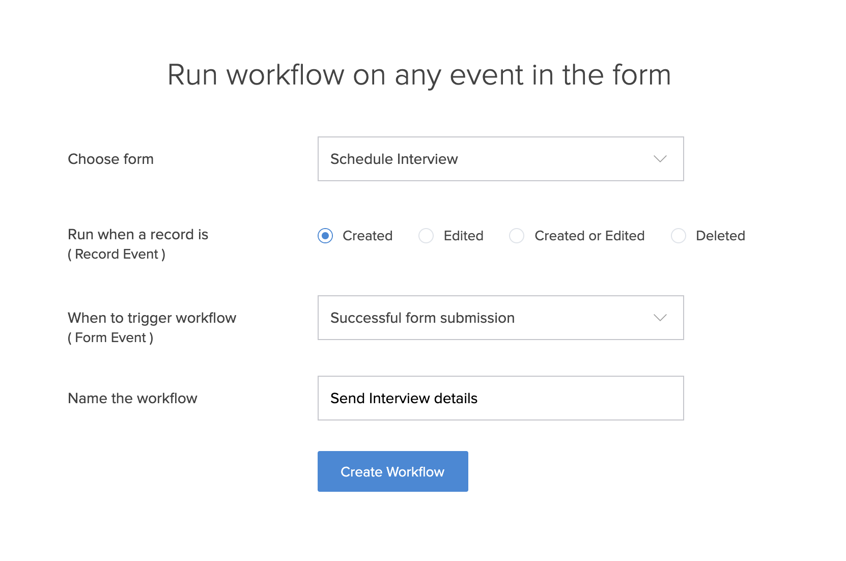 - To create a workflow to send interview details to candidates and update candidate records:Note: Before creating a workflow to send email, you need to configure the mail server. Learn how