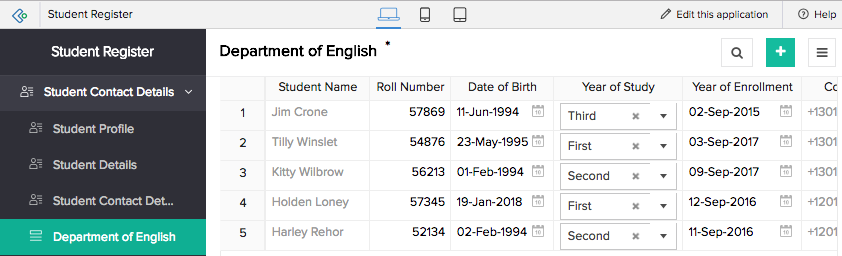 For example, if you have a Student Register application with a report that details the Student Profile that includes personal information and department details, filter will help you effectively compartmentalize the information based on departments. You can add a criteria that filters records matching a specific department to appear in a report. Thus, each department could be a filter criteria based on which the records are displayed.