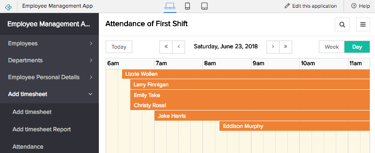 For example, if you have an employee management application with an Attendance report that has in-time and out-time details of employees belonging to different shifts, filter will help you effectively compartmentalize the information. You can add a criteria that filters records matching a specific shift timing to appear in a report. Thus, each shift could be a filter criteria based on which the records are displayed.