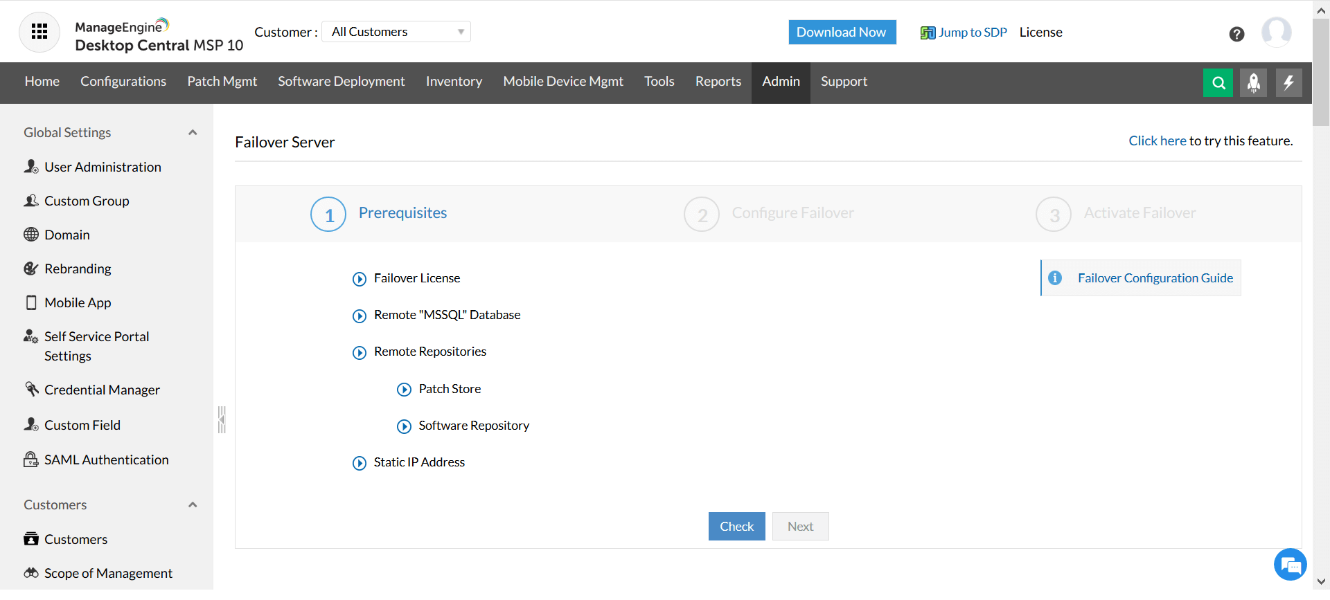 In the Endpoint Central MSP's web console, go to the Admin tab, under Server Settings, click Failover Server.