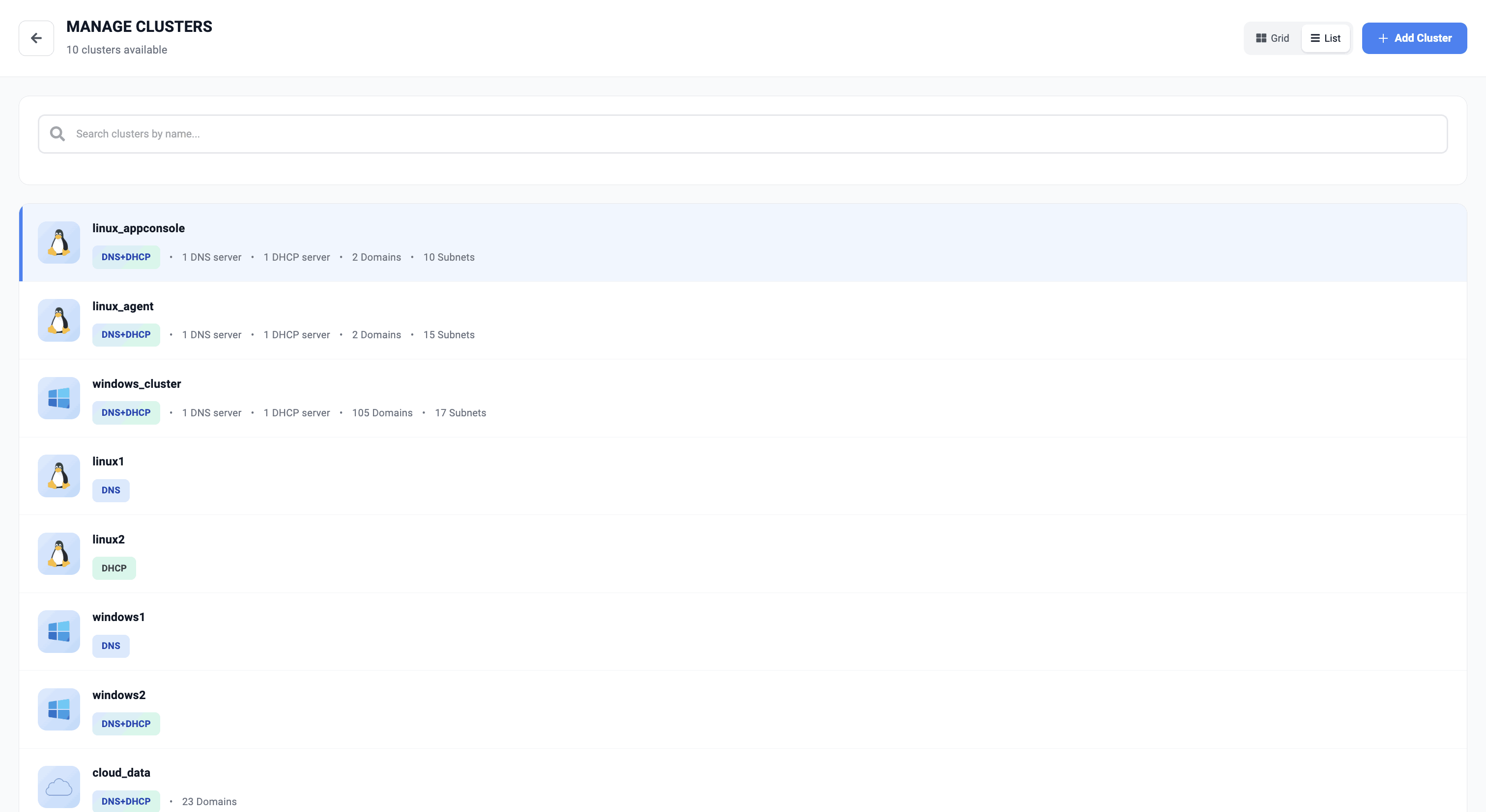 - Clusters are logical groupings of servers - DNS, DHCP or both organized for identification and administrative purposes. These clusters operate independently of other clusters configured within DDI Central. Each cluster you add has its own internalized IP address plans, IP inventory, IP Address Manager, DNS manager and DHCP manager. A single cluster can accommodate any number of DNS servers and DHCP servers.