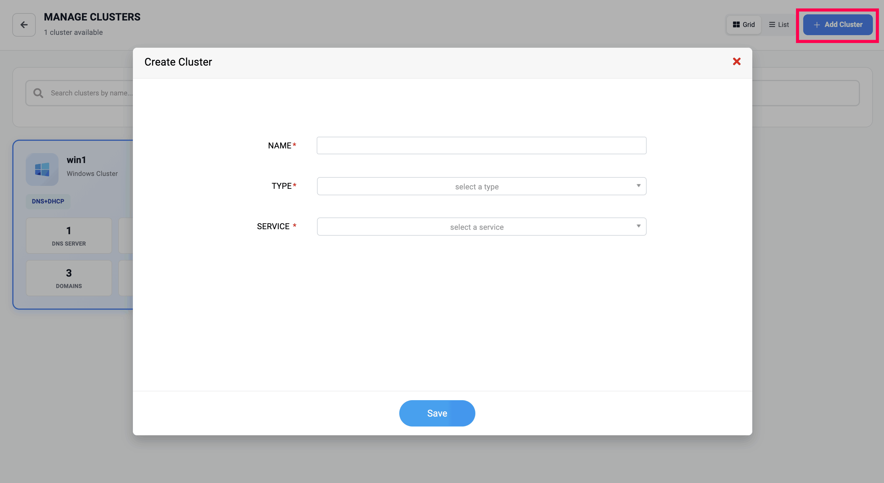 Once the cluster is created you will be directed to the servers page where you'll be prompted to add your DNS and DHCP servers.