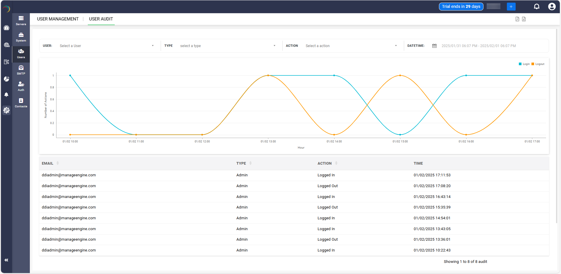 The User Audit tab can be accessed by selecting the Audit menu from the left menu bar. The User audit tab helps you monitor your users' login activities by capturing the username, date, and timestamp of the latest login activities.