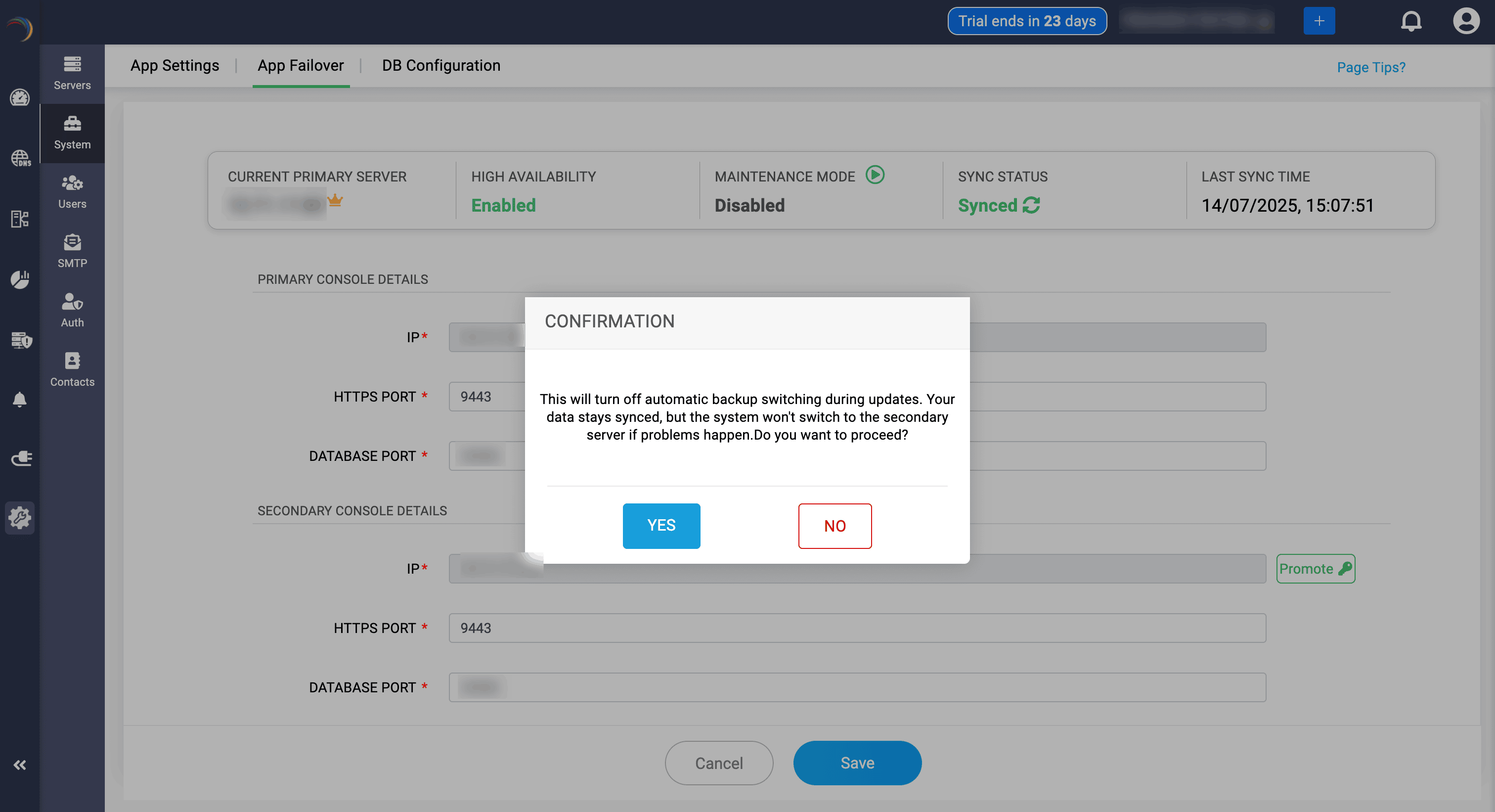 When the current secondary server is up and ready, if the admin wants to promote it as the primary for handling the service, they can be promoted by clicking on the Promote button.