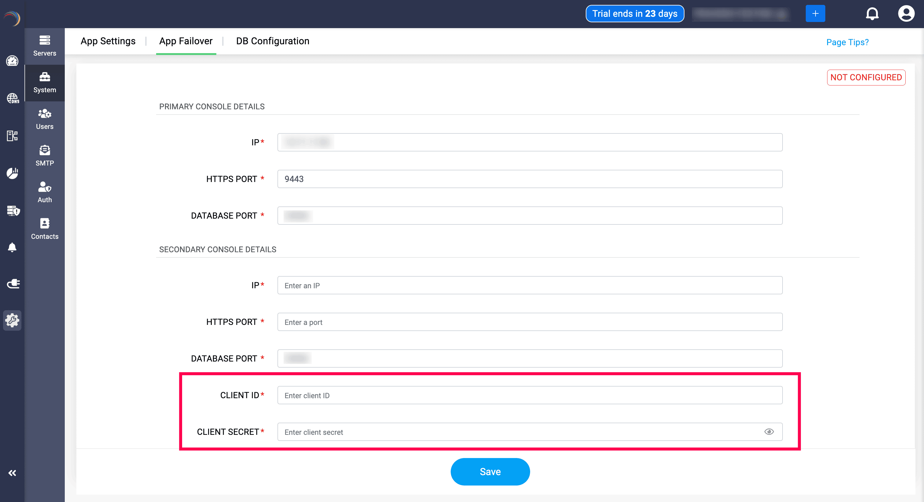 When configuring the failover in DDI Central, users need to provide secondary server's client ID and client secret in the fields.