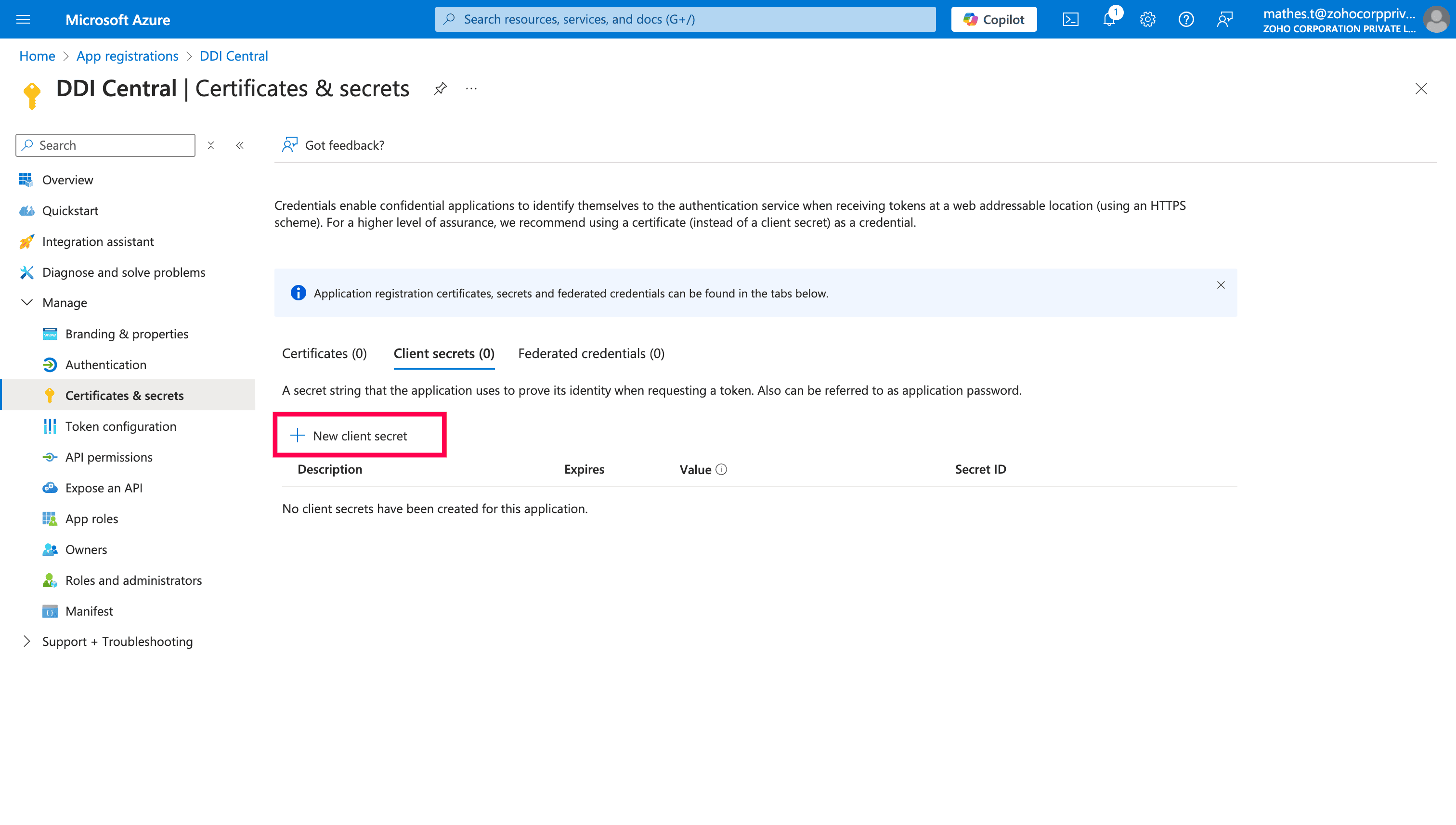 Note: Client secret values cannot be viewed, except for immediately after creation. Be sure to save the secret when created before leaving the page, as it will become unreadable after some time.
