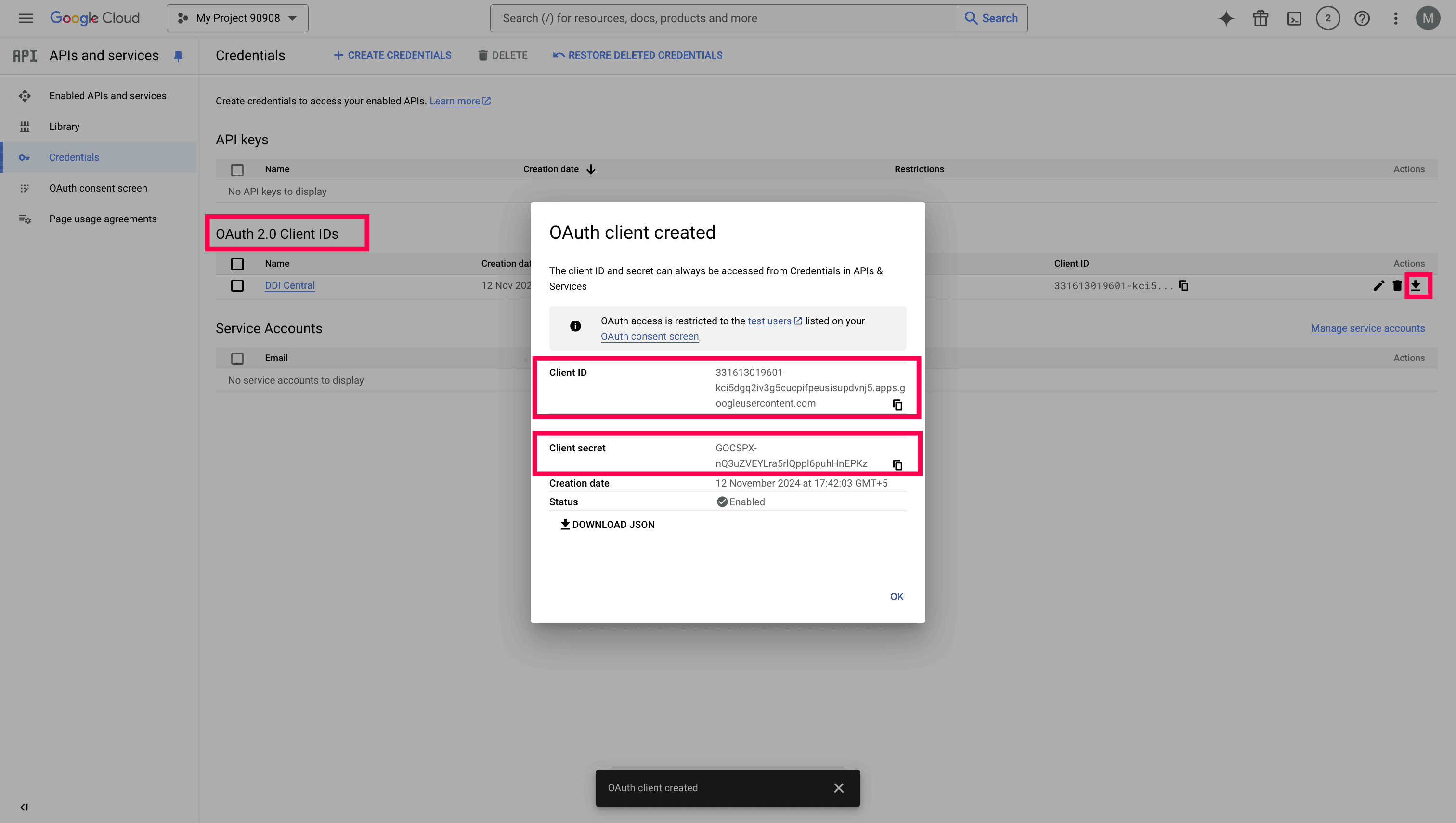 Once the credentials have been created, the Client ID and Client secret can be accessed by clicking on the download button along the App name under the OAuth 2.0 Client IDs section as shown in the dialog box. Copy both the values to configure OAuth provider settings in DDI Central's Management UI Console