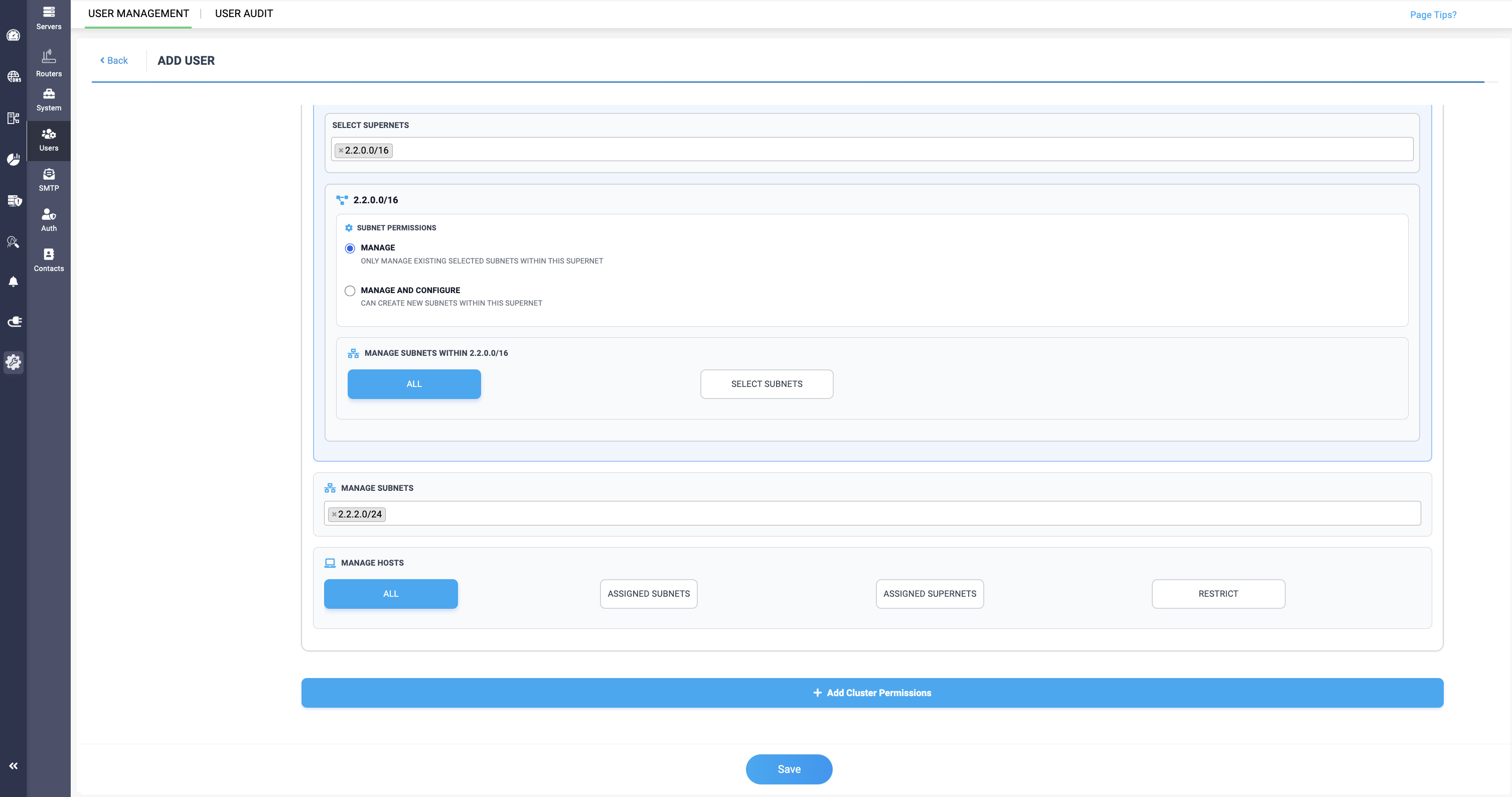 Select the supernet you want to grant access for the users in the Select Supernets field.When the supernet is selected, two new options gets displayed for the SUPERNET PERMISSION:- MANAGE - This option can only allow the user to manage the existing subnets in the selected supernet.