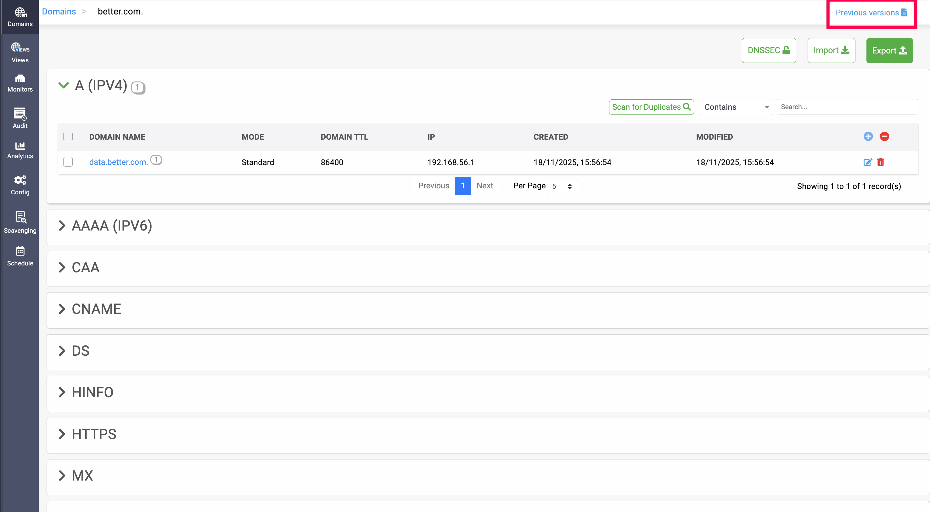 Zone versioning in DDI Central allows to view the previous versions of the zone, which can also be exported or restored as the current version.