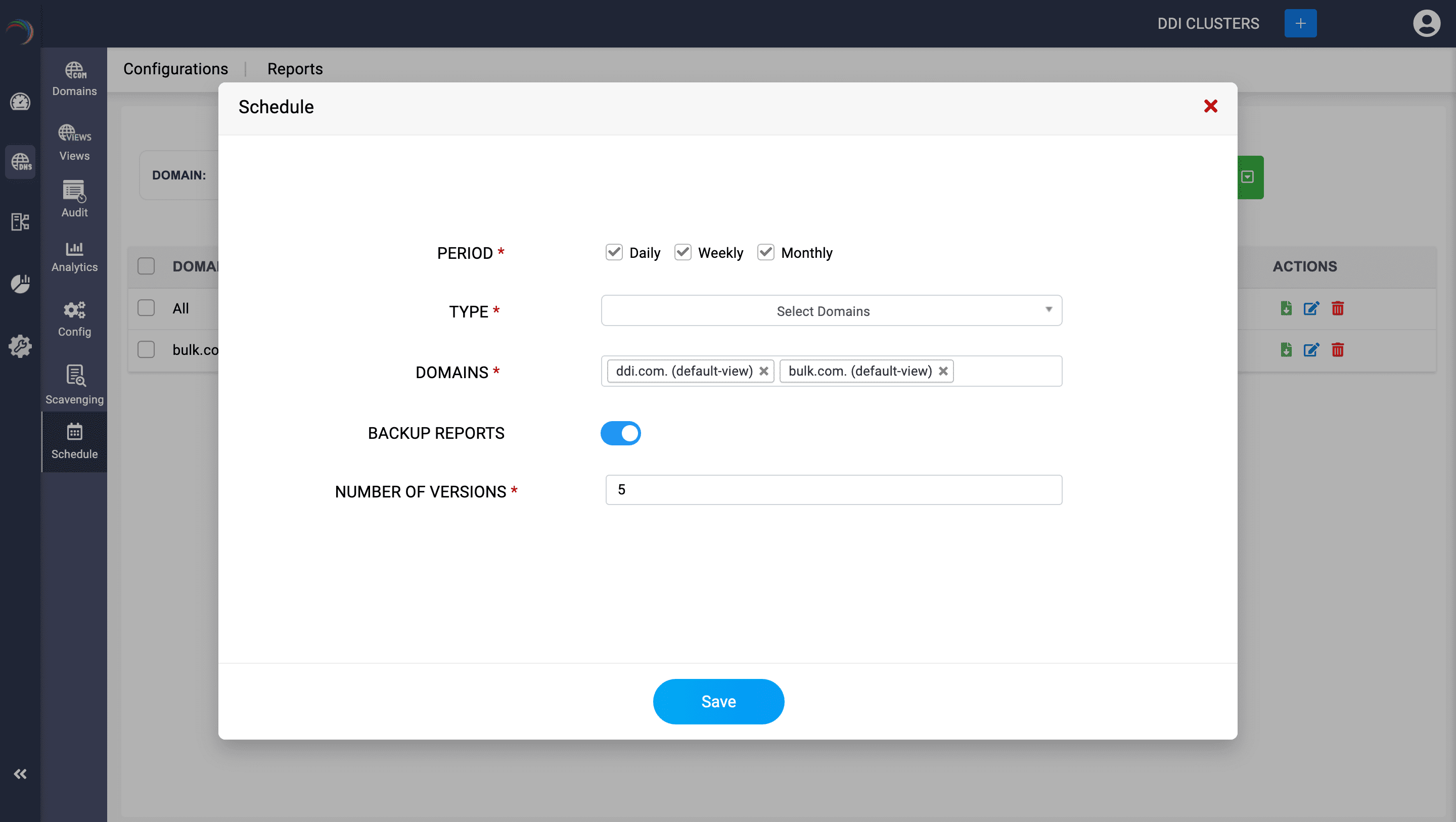 - BACKUP REPORTS: Enabling Back Up if required drives DDI Central to store latest versions of the DNS reports in the app for admin's reference. Specify the number of versions of the automatically generated DNS reports to be saved or backed up for future reference, analysis, or archival purposes. For instance, if you select a reporting frequency of both daily and weekly, and you specify the number of backup reports as 5, DDI Central will maintain the five most recent daily and weekly reports as backups under the cluster. These reports can then be accessed and directly downloaded from the DDI Central user interface by the admin.