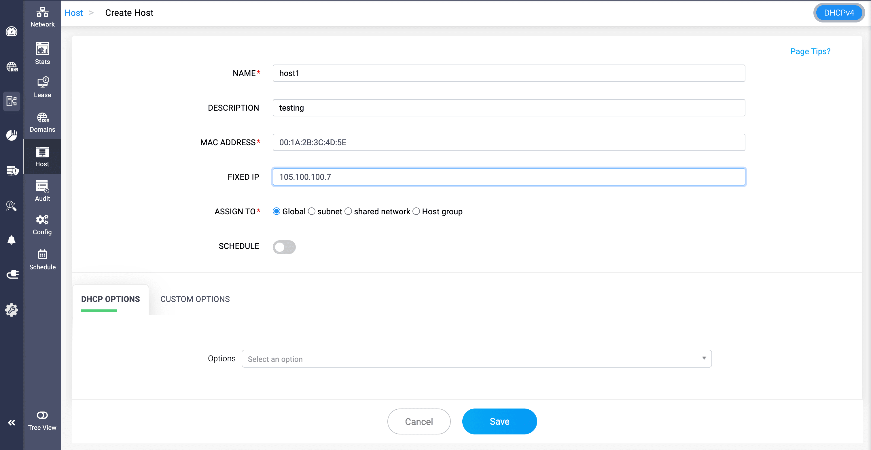 SCHEDULE: Schedule when this reservation should be active. Activate it for time-bound temporary reservations.DHCP OPTIONS: Select standard DHCP options (e.g., router, DNS server, lease time) for the host.CUSTOM OPTIONS: Tailor your own custom DHCP options that suits your complex requirements (e.g., vendor-specific options).Click Save to finalize the configurations.
