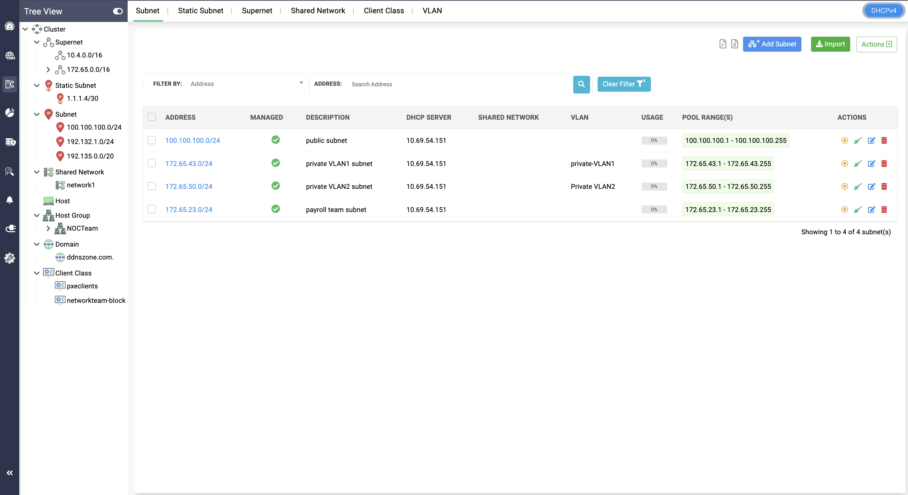 DDI Central enables administrators to import IPv4/IPv6 subnets, multicast subnets, and hosts/DHCP reservations in bulk using CSV files. This feature simplifies large-scale network configuration and reduces manual entry errors.