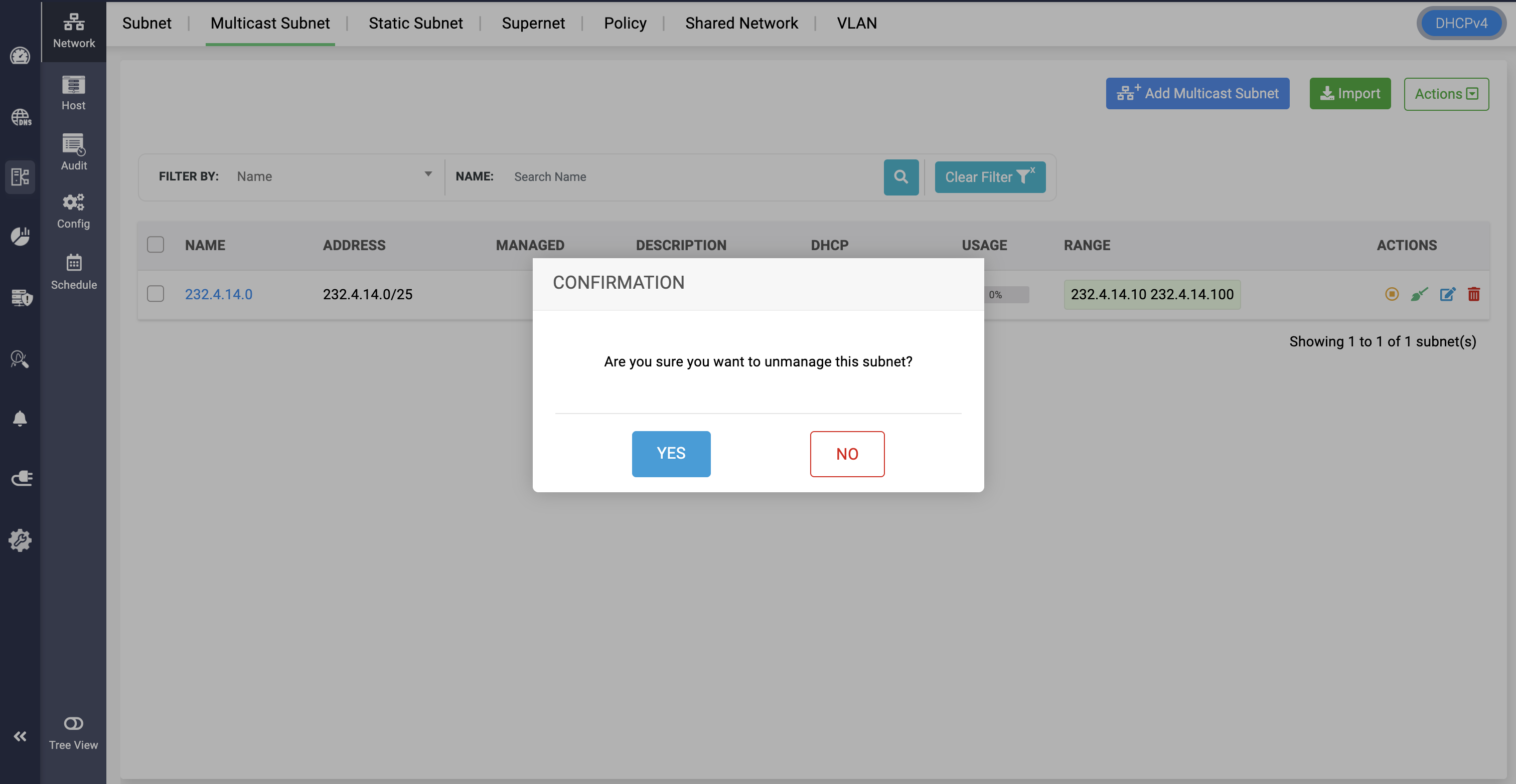 Note: Multicast subnets can be unmanaged and managed from serving in the DHCP server by clicking on the Yellow icon and confirming to Unmanage the subnet.