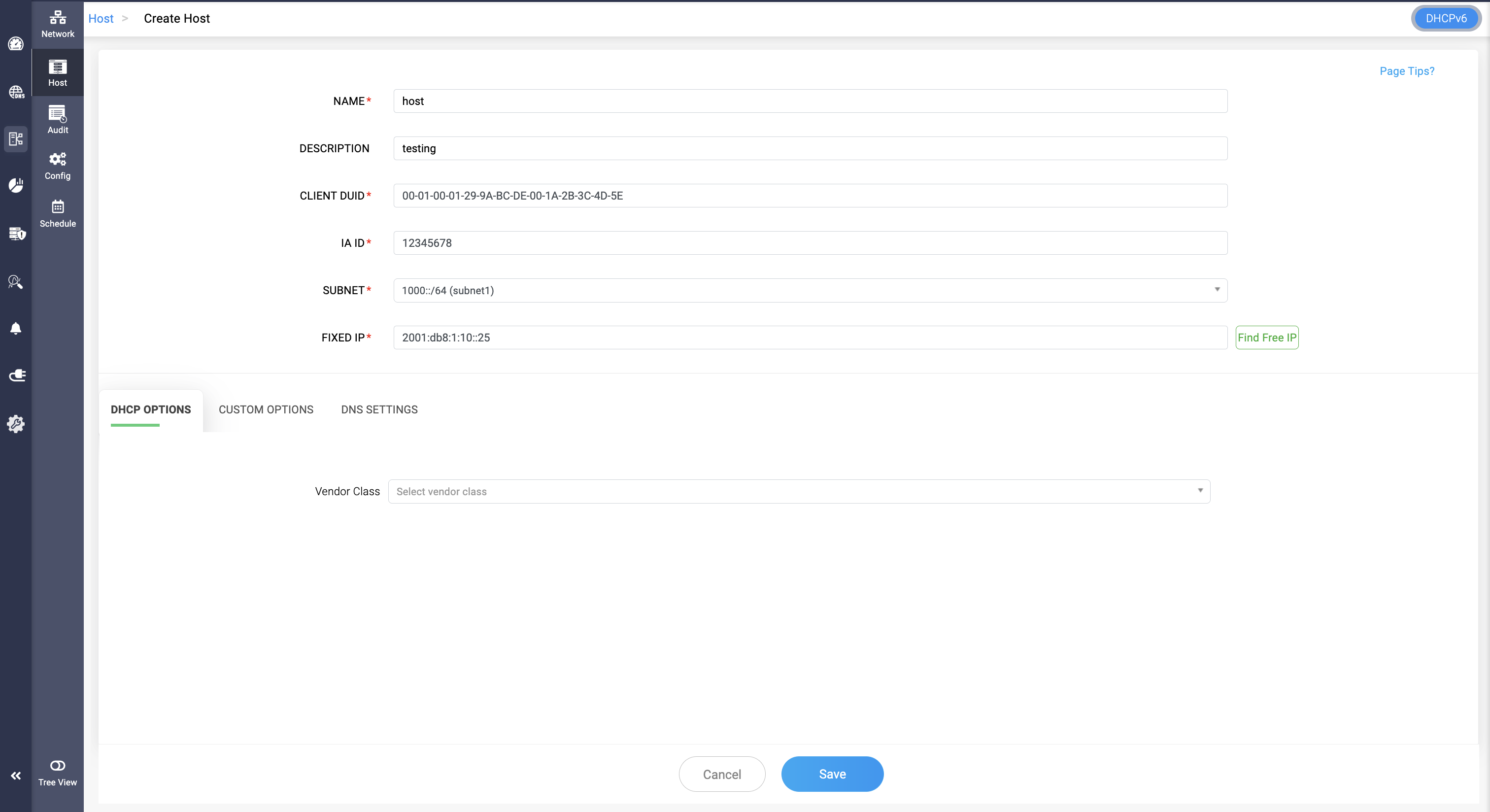To create a DHCPv6 based host, just specify additional details like: