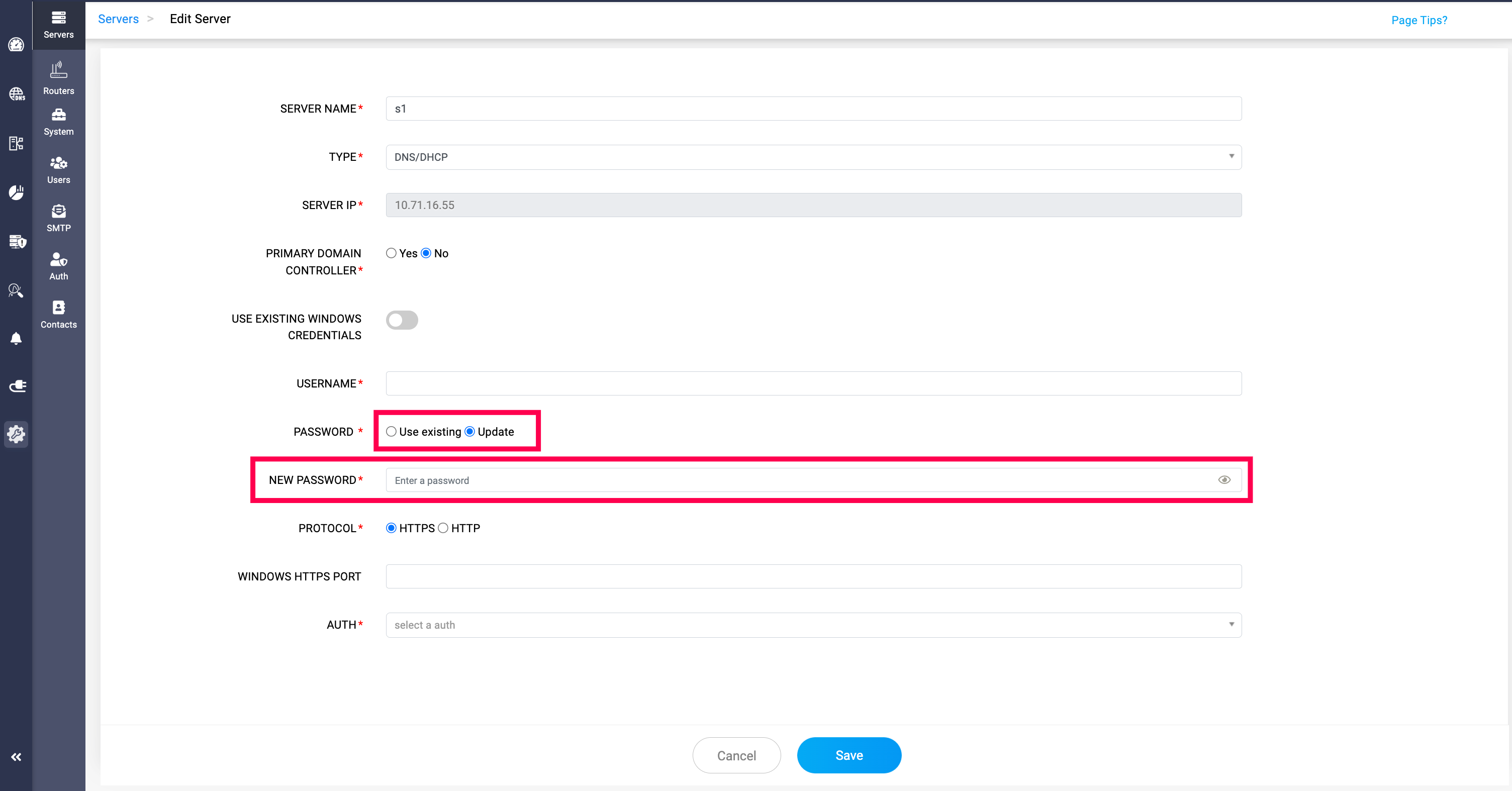Note: By clicking the Edit option and disabling USE EXCISTING WINDOWS CREDENTIALS, you can update the existing password by selecting the Update option and entering the new password in the NEW PASSWORD field.