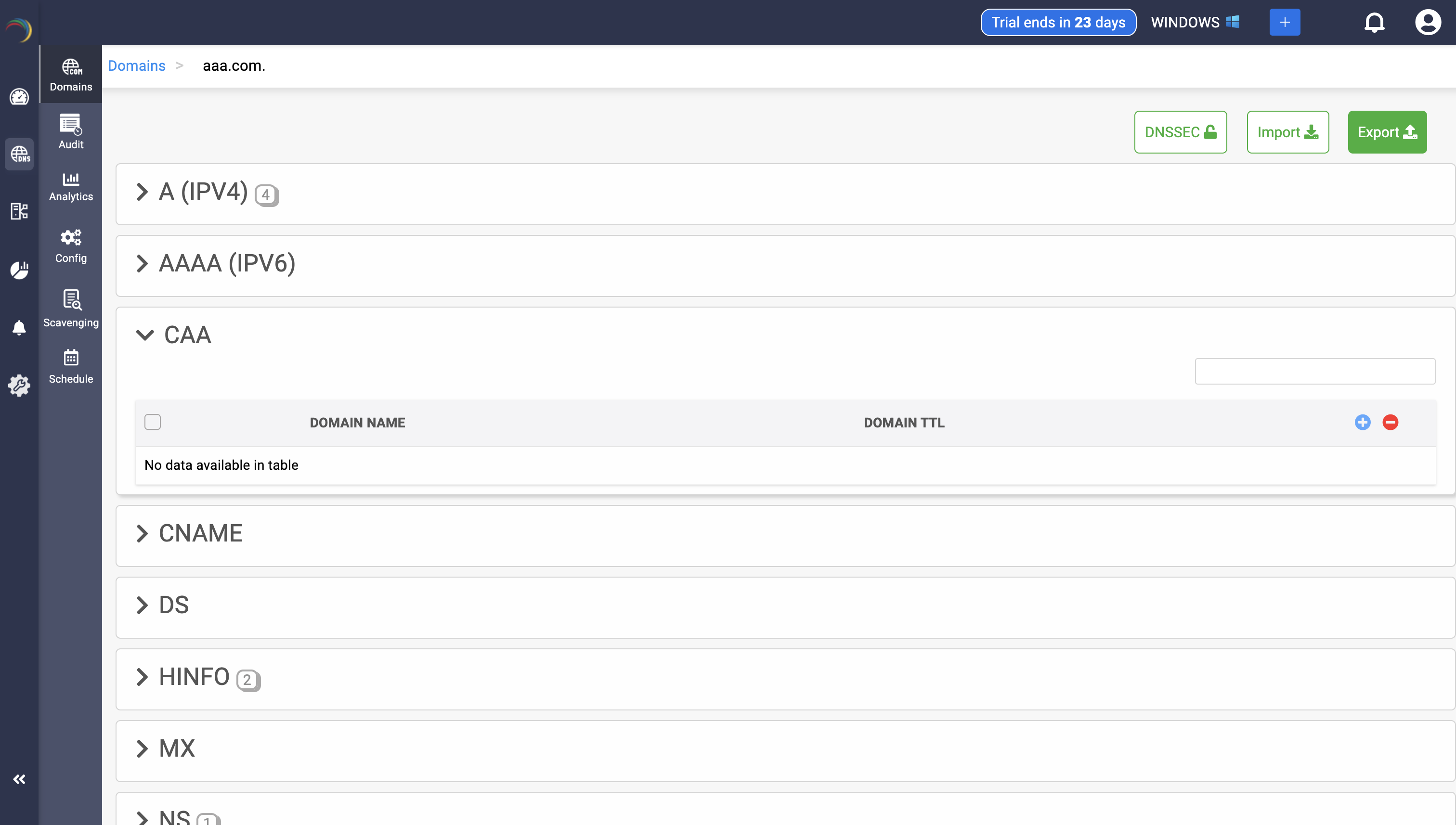 Step 1: Click on the CAA record of the DNS zone for a domain.