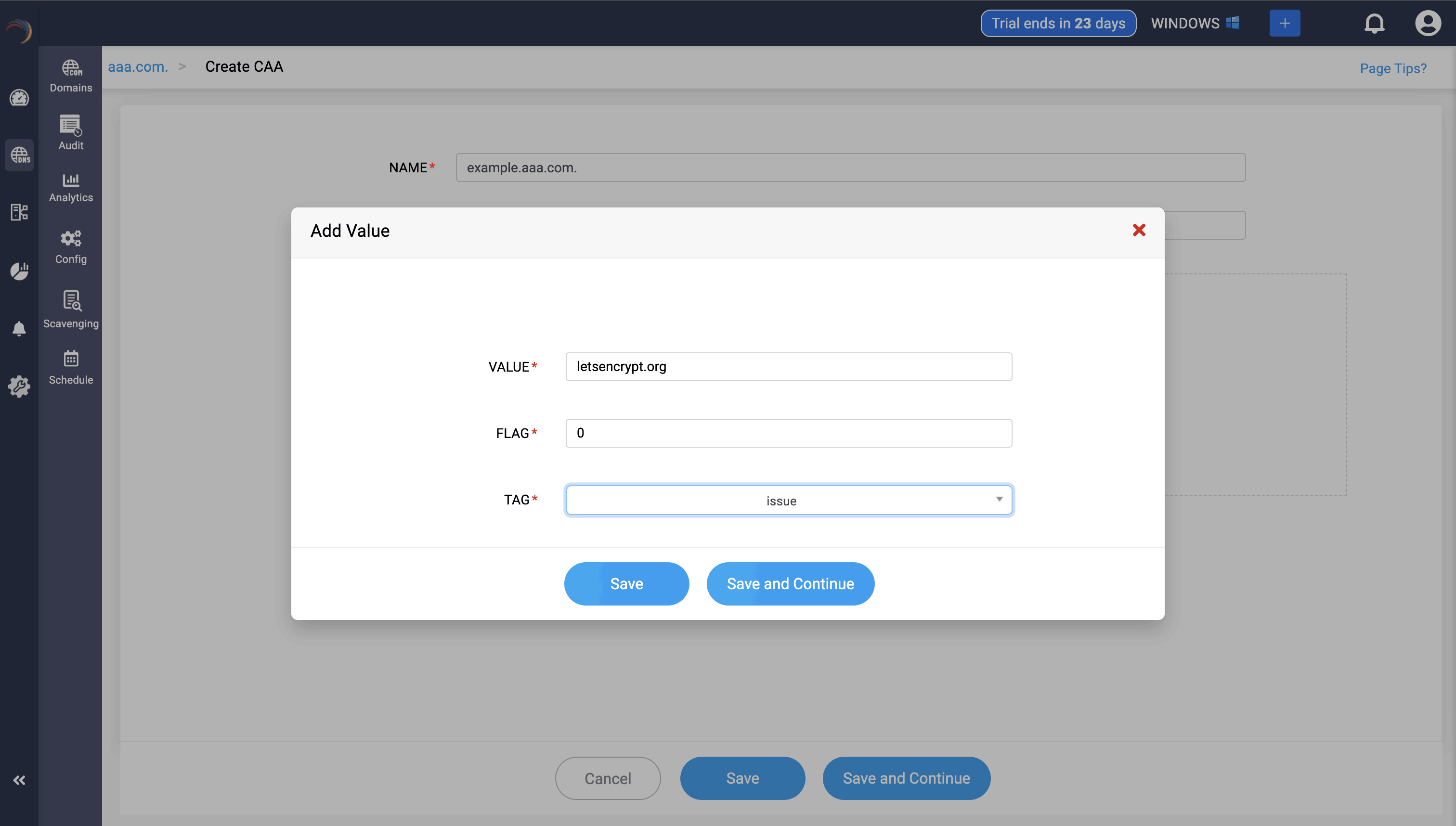 Step 3: Provide the details of the new CAA record, such as name, TTL, date and time, there are three values in the Add Value section.