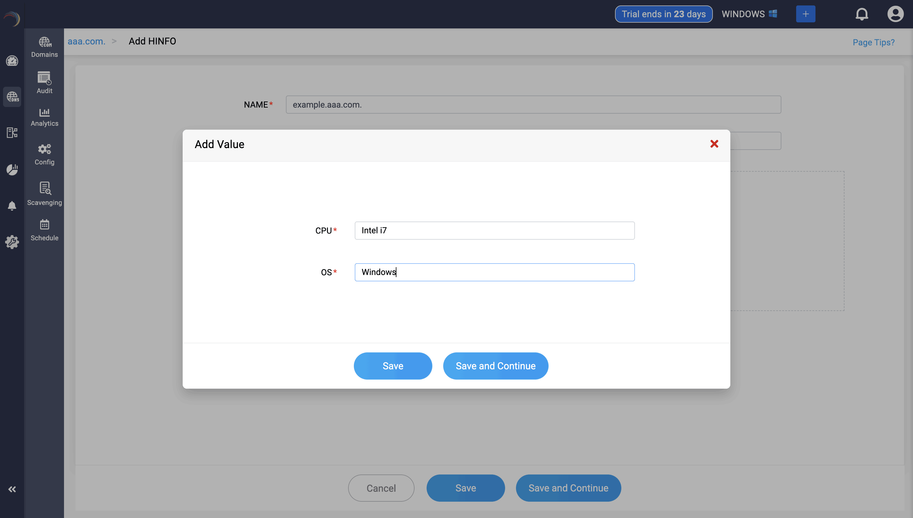 Step 3: Provide the details of the new HINFO record, such as name, TTL, date and time. There are two field in the Add Value section.