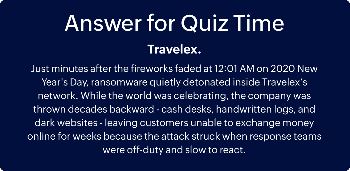 At 12:01 AM on New Year's Day 2020, which company had a ransomware attack and reverted to pen-and-paper operations for weeks, disabling customers to exchange money online?