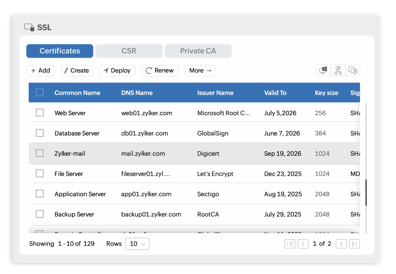 Key Manager Plus consolidates certificates regardless of where they originate. Public CA certificates from DigiCert, Let's Encrypt, Sectigo, and other authorities coexist with private CA certificates, Microsoft Certificate Authority issuances, and self-signed certificates in one searchable repository. Every certificate flows into one central location for consistent management.