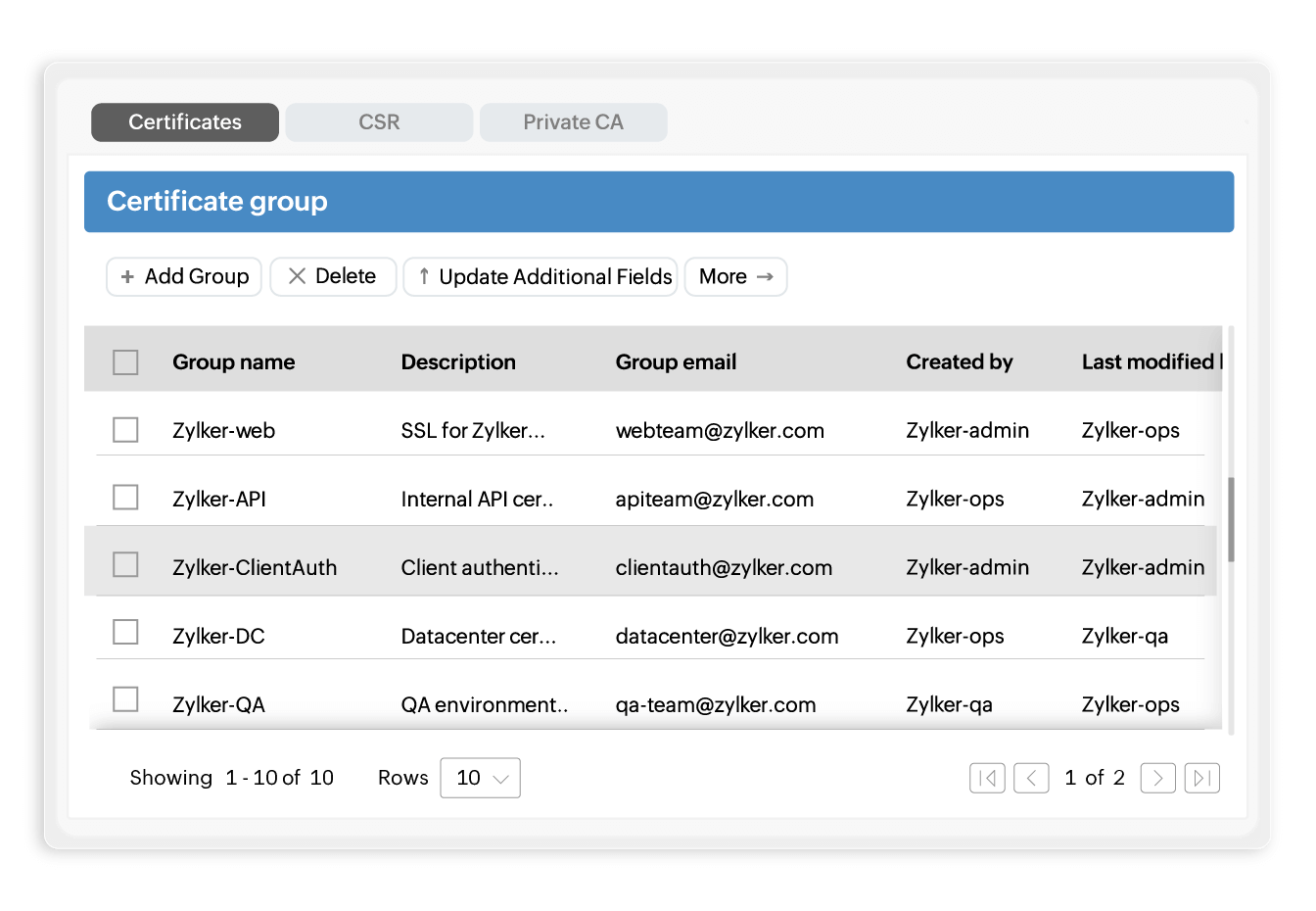 Combine certificates into groups based on specific certificate selection or dynamic criteria like issuer, common name, key size, or custom fields. Dynamic groups automatically include future certificates matching your criteria, maintaining organization as your infrastructure grows. You can apply bulk operations to entire groups including expiry notification updates, certificate exports, and trust store generation to reduce repetitive manual work.