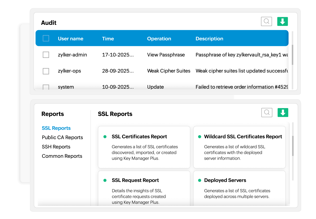Every certificate operation generates detailed audit trails capturing who performed what action and when. Track discovery operations, deployment activities, renewal attempts, and user access to certificates. You can generate comprehensive reports on certificate inventory, expiry status, deployment locations, and authority sources and schedule automatic report delivery to stakeholders in the format of their choice.