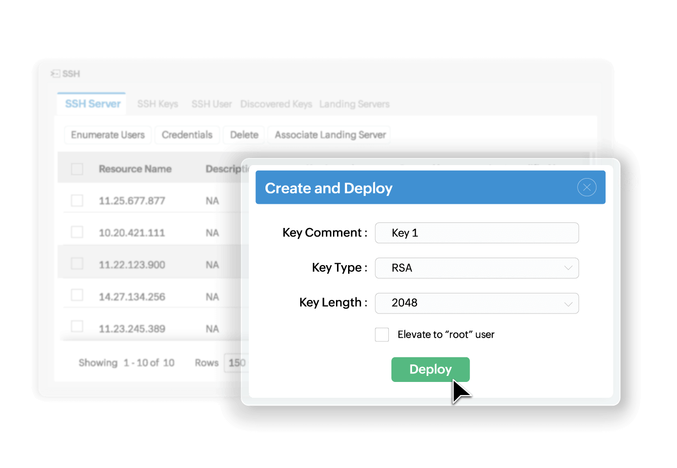 Streamline SSH key provisioning with one-click creation and automatic deployment directly to your target systems. With Key Manager Plus, you can generate unique key pairs for each user account with a single click, which eliminates manual configuration steps and deploy them automatically to target servers where the user account is present.