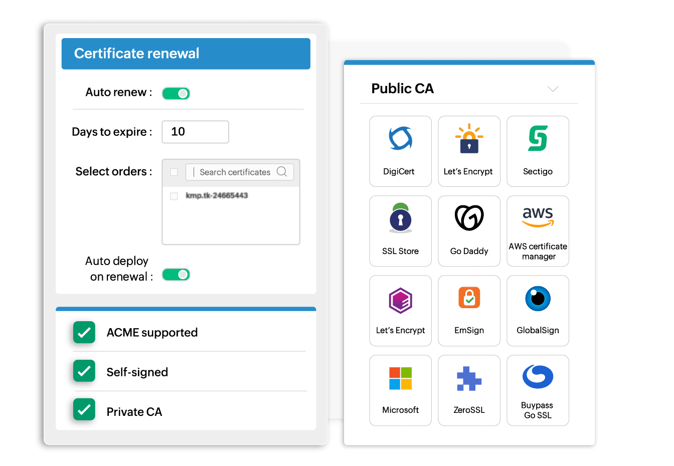 When Key Manager Plus automatically renews certificates the renewed certificates can be automatically deployed to their target locations. Whether signed from public CAs, private CAs, or through self-signing, your certificates get deployed regardless of the issuing authority.