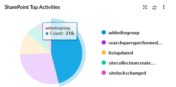 | SharePoint Top Activities | Displays a pie chart of the top SharePoint activities such as group additions, search queries, list updates, and site creation. |